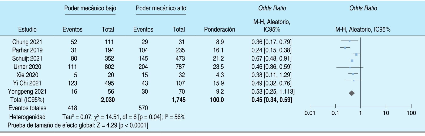 En el metaanálisis de siete estudios (n = 3,775), el poder mecánico bajo se asoció con mayor supervivencia en pacientes en ventilación mecánica (OR 0.45, IC95% [0.34-0.59]; I2 56%) (Figura 3). Dado que el objetivo primario de algunos estudios no fue analizar la relación del poder mecánico con otros desenlaces, no realizamos análisis de subgrupos.