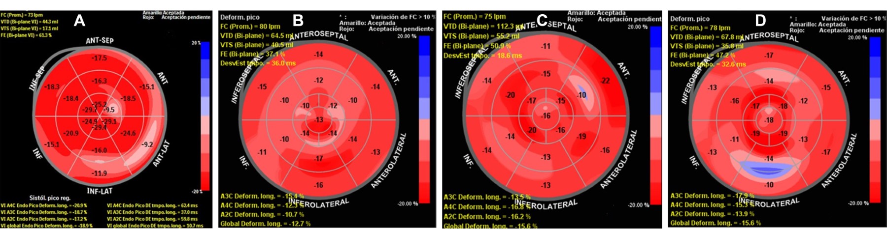 Las variables ecocardiográficas estudiadas incluyeron el GLS; el análisis bidimensional de deformación se realizó mediante el método de speckle-tracking en las tres proyecciones apicales (cuatro y dos cámaras y eje largo apical). Un gráfico polar de estos segmentos (ojo de buey) proporcionó las representaciones visuales y cuantitativas de la función regional del VI mediante el trazo de valores codificado por colores de la tensión sistólica máxima. En este estudio, el valor del GLS se expresa en valores negativos y se determinó el punto de corte en -16.0%; entre más negativo sea el valor, demuestra mejor función cardiaca.