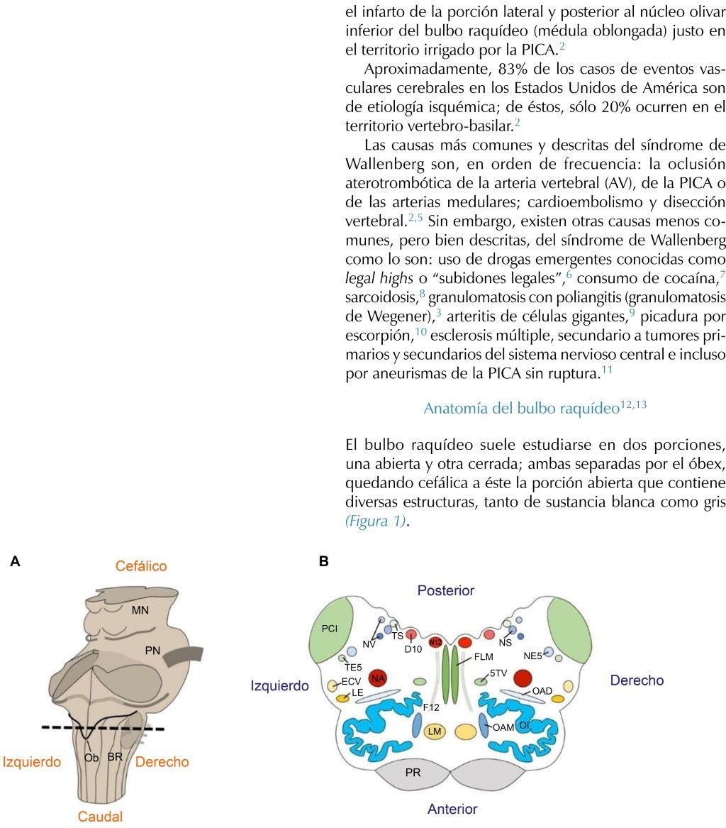 El síndrome de Wallenberg es la presentación clínica más frecuente del evento vascular cerebral en la circulación posterior. Su manifestación clínica incluye una gama diversa de signos y síntomas, la mayor parte de los cuales se explican fácilmente por la correlación anatómica con las estructuras afectadas. Su estudio es un reflejo claro de la importancia de la neuroanatomía en la aplicación clínica. Descrito por primera vez en 1895 por el neurólogo polaco Adolf Wallenberg, el síndrome de Wallenberg es causado por el infarto de la porción lateral y posterior al núcleo olivar inferior del bulbo raquídeo justo en el territorio irrigado por la arteria cerebelosa posteroinferior (PICA). Las causas más comunes y descritas del síndrome de Wallenberg son, en orden de frecuencia, la oclusión aterotrombótica de la arteria vertebral, de la PICA o de las arterias medulares, cardioembolismo y disección vertebral. Sin embargo, existen otras causas menos comunes del síndrome de Wallenberg como lo son el uso de drogas emergentes conocidas como legal highs o "subidones legales", consumo de cocaína, sarcoidosis, granulomatosis con poliangitis (granulomatosis de Wegener), arteritis de células gigantes, picadura por escorpión e incluso por aneurismas de la PICA sin ruptura. En este artículo se revisa las características clínicas específicas del síndrome de Wallenberg y los detalles de las bases neuroanatómicas de sus principales manifestaciones clínicas.ABREVIATURAS: