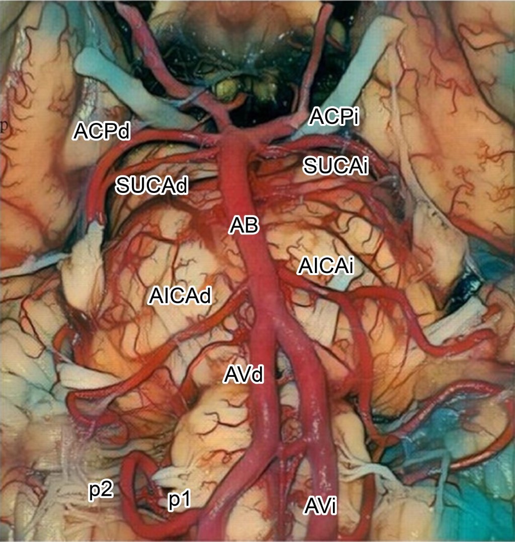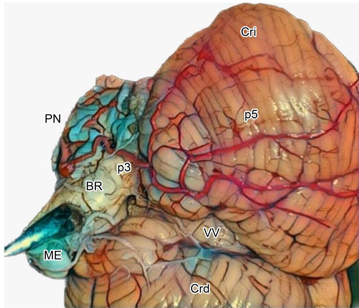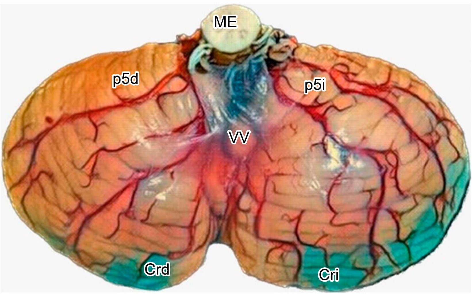 El segmento p3, llamado segmento tonsilobulbar, se relaciona con la mitad caudal de la amígdala cerebelosa; la porción p4, o segmento telovelotonsilar, se encuentra en la hendidura entre la tela coroidea y el velo medular inferior rostralmente y caudalmente el polo superior de la amígdala cerebelosa; finalmente, el segmento p5, denominado segmento cortical, se encuentra en la superficie cortical de los hemisferios cerebelosos ( Figura 5, se visualiza segmento p5 de la PICA).19,20