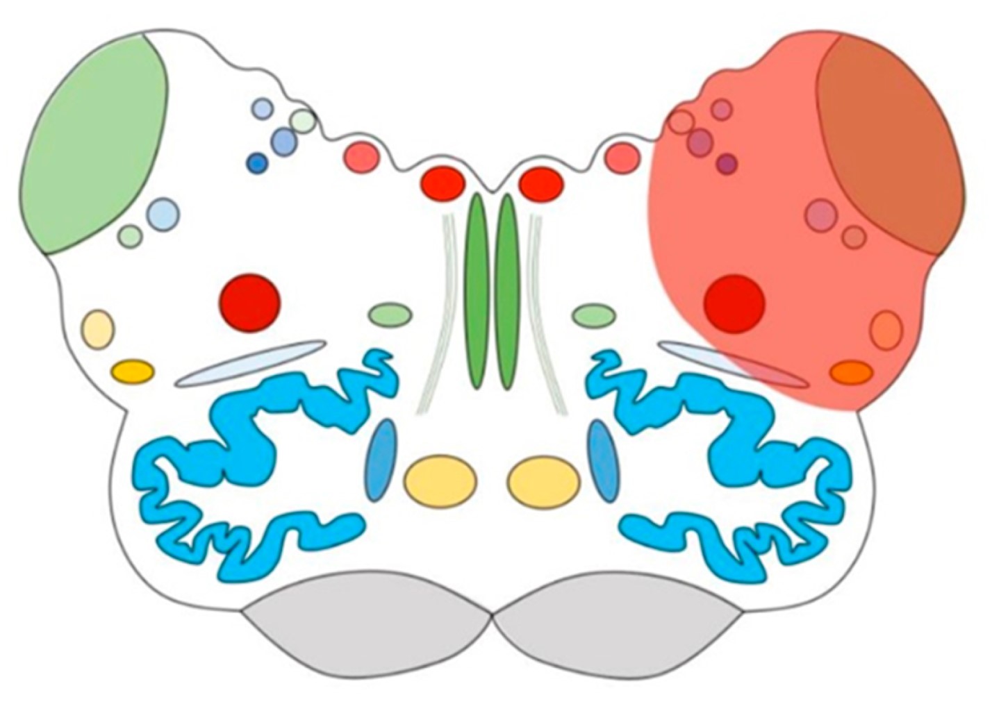Núcleo ambiguo (NA): este núcleo contiene las células encargadas de inervar a los músculos del paladar blando, faringe, laringe y esófago superior a través de los nervios craneales glosofaríngeo, vago y accesorio. Asimismo, contiene neuronas parasimpáticas que controlan la frecuencia cardiaca a través del nervio vago.