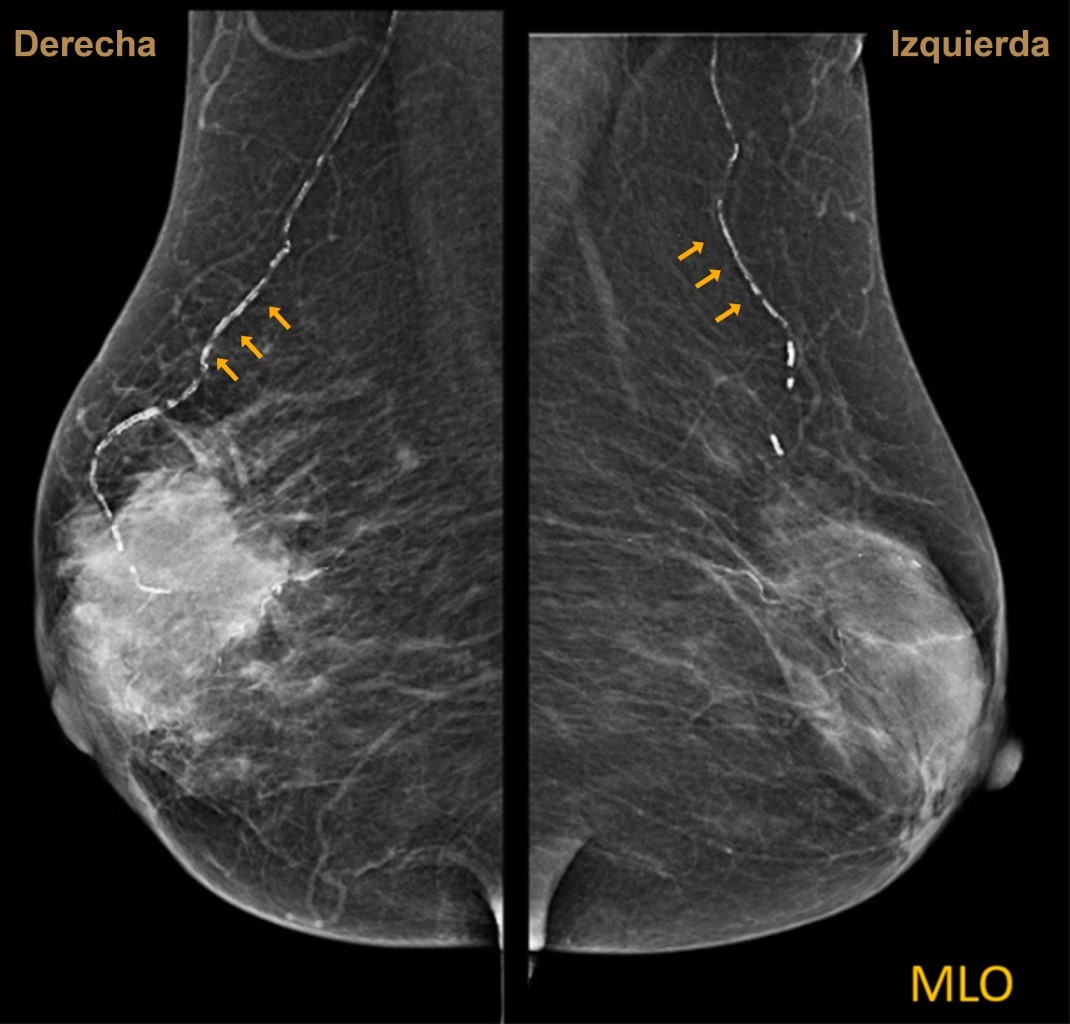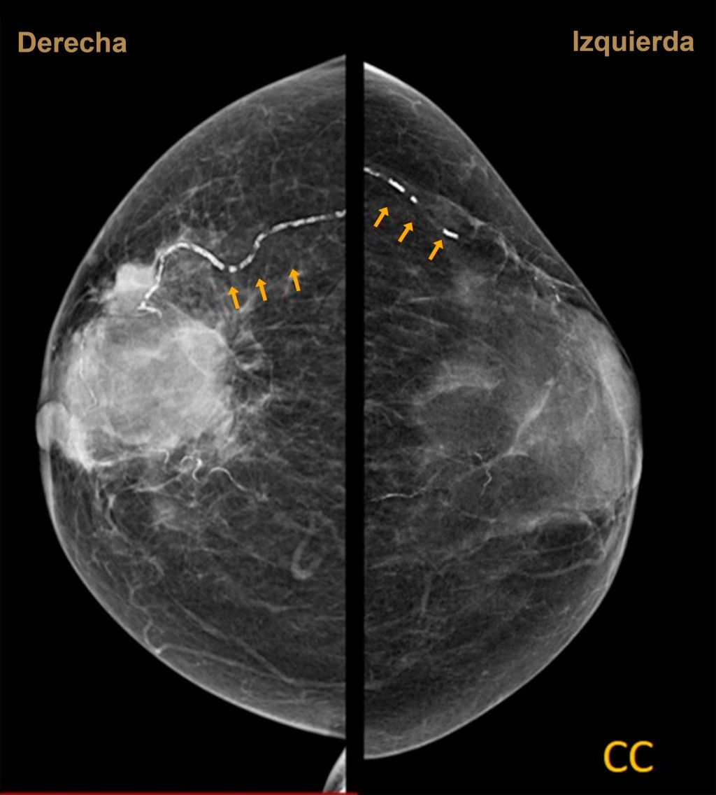 Se trata de paciente femenino de 74 años con antecedente de diabetes mellitus tipo 2. Acude a mastografía de tamizaje. Se aprecian dos proyecciones, densidad mamaria tipo B, con un nódulo irregular hiperdenso de márgenes espiculados de 5.1 × 5.2 cm en sus ejes mayores y se aprecian calcificaciones lineales (Figuras 1 y 2). Se otorga categoría BI-RADS 5.