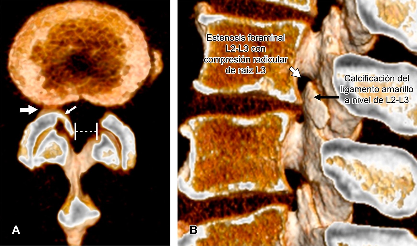 Calcificación del ligamento amarillo ocasionando estenosis foraminal y compresión radicular L3 derecha