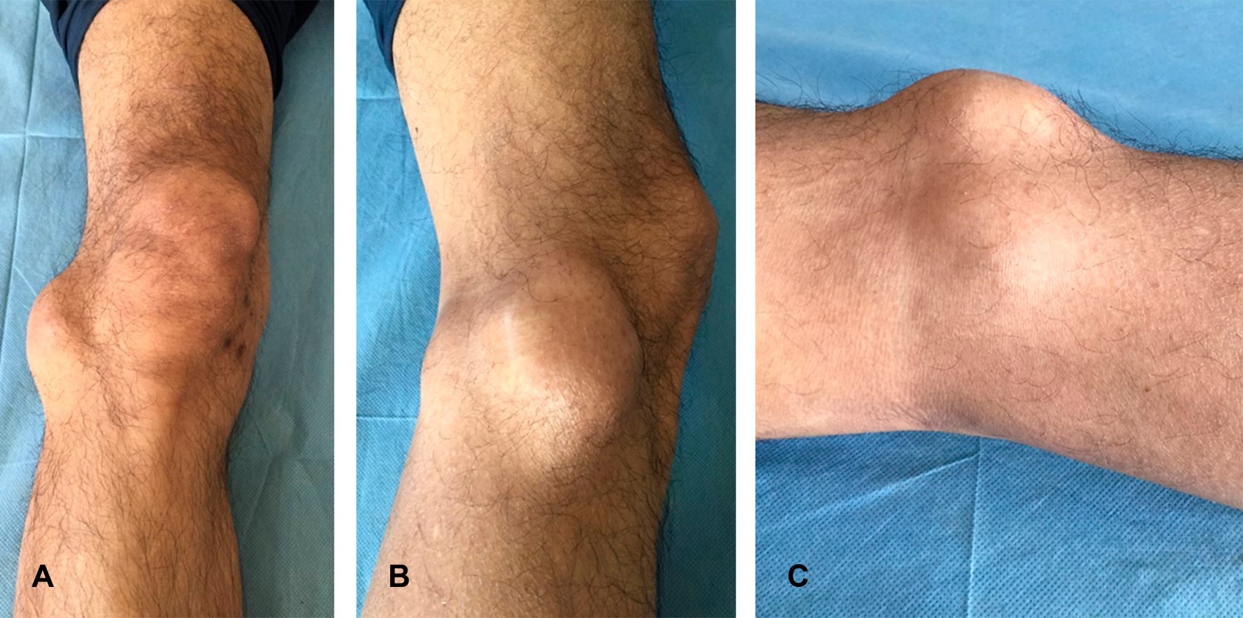 Masculino de 35 años, quien acude por presentar aumento de volumen de 7 × 5 cm en cara lateral de rodilla derecha, con prolongación hacia el hueco poplíteo (Figura 1), el paciente relata que fue incrementando su tamaño a lo largo de un año. A la exploración dirigida: masa mencionada de consistencia ahulada, a tensión, no dolorosa que permite movimientos articulares normales; siendo positiva la prueba de Apley para menisco externo; el ecosonograma confirmó la presencia del quiste parameniscal (QP) (Figura 2). La prevalencia de quistes meniscales se ha estimado entre 1 y 8%. Los quistes meniscales son colecciones intrameniscales o más frecuentemente parameniscales que conforman una cavidad llena de líquido sinovial, recubierta por tejido sinovial evaginado conectado al espacio meniscal. De manera regular se asocian a lesión meniscal traumática o degenerativa, con más frecuencia, en relación al menisco medial 3:2 con respecto del lateral. Se originan por cambio de presiones unidireccional en sentido extraarticular. Su prevalencia es 1 a 8%. Cuando los QP son sintomáticos o crecen se pueden resolver quirúrgicamente por vía artroscópica mediante la obliteración del canal de comunicación con la articulación además de plastia de menisco dañado.
