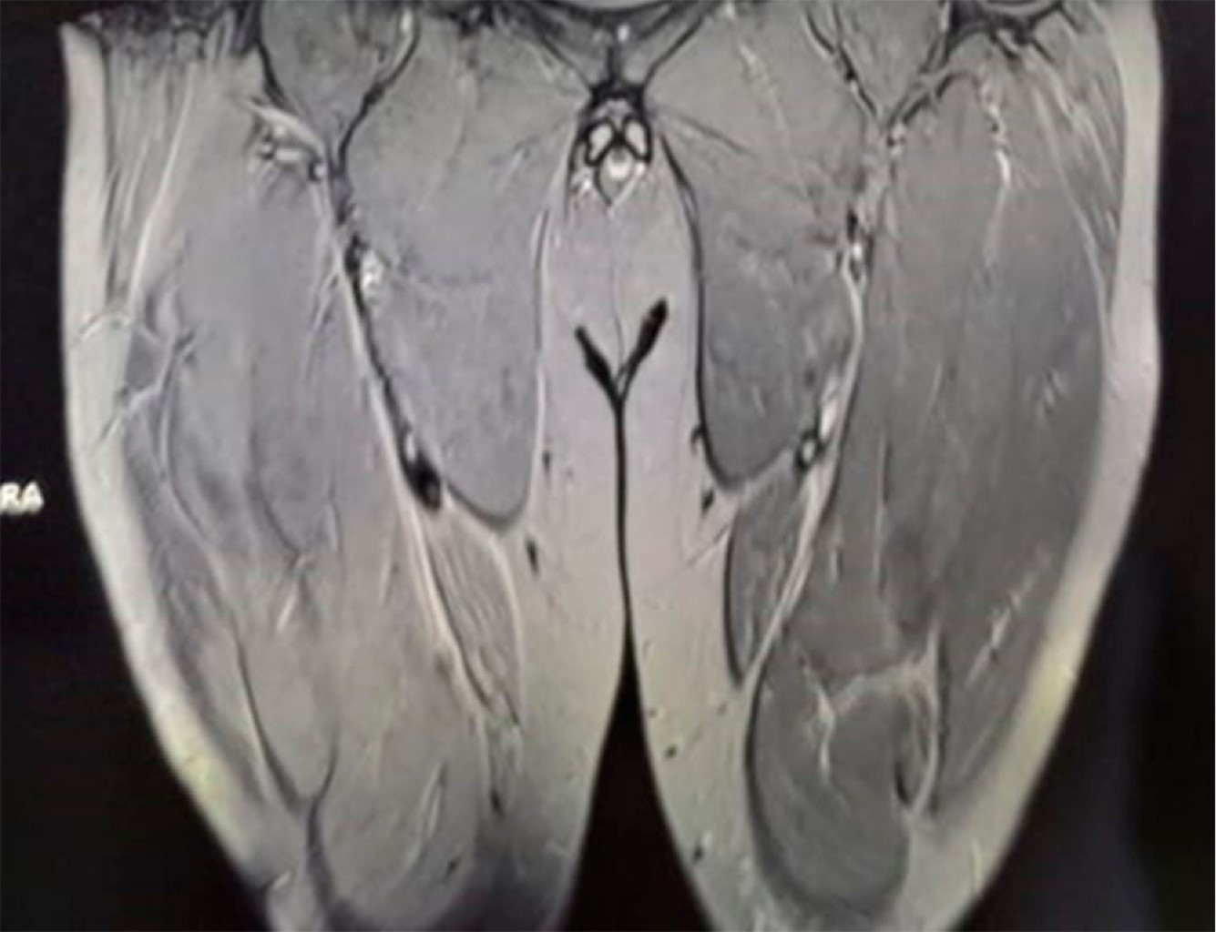 Masculino de 42 años quien realizó ejercicio intenso por 80 minutos, 24 horas después presentó tumefacción dolorosa en cara anterior de ambos muslos, especialmente el derecho con aumento de volumen; incapacidad para la ambulación por dolor en muslos, además de orina oscura. Con diagnóstico presuncional de rabdomiólisis postejercicio. El laboratorio mostró: creatina cinasa (CPK) 11,000 U/L; transaminasa glutámico-oxalacética (TGO) 1,600 U/L; transaminasa glutámico-pirúvica (TGP) 280 U/L; el examen general de orina (EGO) oscura sin hematíes. La resonancia magnética (RM) mostró edema muscular de predominio derecho en cuádriceps y disrupción parcial de fibras del recto anterior (Figura 1).
