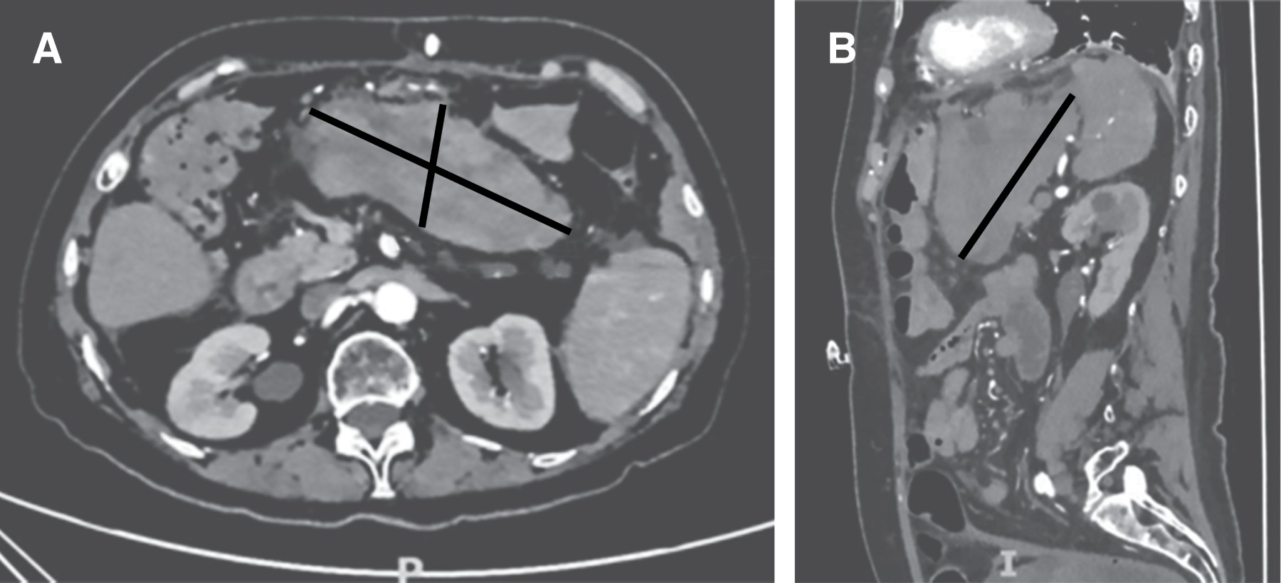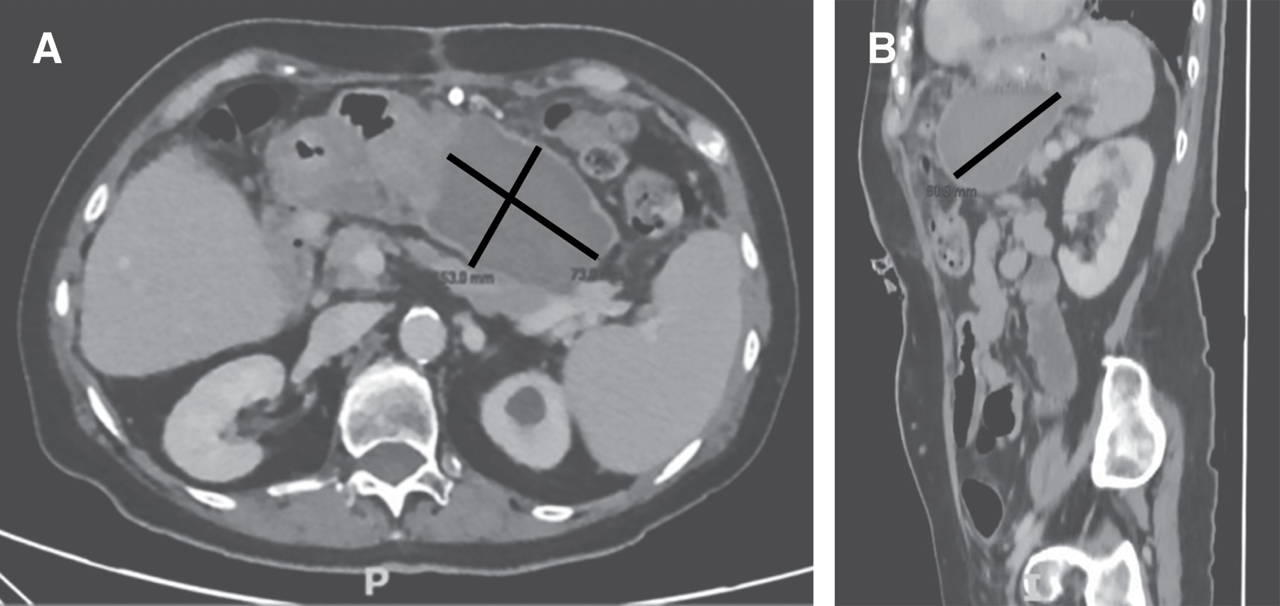Dos semanas posteriores, la paciente ingresa a hospitalización por síntomas respiratorios y disminución de hemoglobina, por lo que se toma una TAC de control evidenciando un hematoma epigástrico de 11.8 × 5.5 × 10.8 cm sin datos de sangrado activo (Figura 2). Se transfunden dos paquetes globulares, logrando estabilidad hemodinámica y posterior alta de hospitalización.