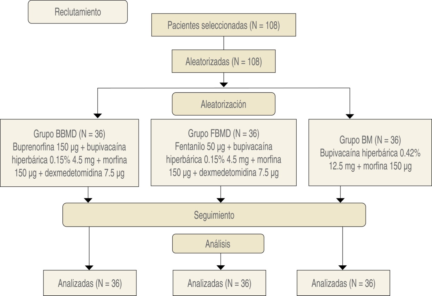 Se incluyeron pacientes de 35 a 55 años, programadas de forma electiva para HTA, neurológicamente íntegras y en pleno uso de sus facultades mentales, con estado físico según la ASA como I y II, sin antecedentes de alergia a los medicamentos que se emplearon y que aceptaran la técnica anestésica regional. Se registraron variables clínicas y antropométricas, así como los signos vitales (SV) tomados en el lugar de pacientes prequirúrgicas, los cuales se consideraron como basales. Grupos de estudio: grupo BBMD (buprenorfina 150 μg + bupivacaína hiperbárica 0.15% 4.5 mg + morfina 150 μg + dexmedetomidina 7.5 μg), grupo FBMD (fentanilo 50 μg + bupivacaína hiperbárica 0.15% 4.5 mg + morfina 150 μg + dexmedetomidina 7.5 μg) y grupo BM (bupivacaína hiperbárica 0.42% 12.5 mg + morfina 150 μg). Se inició la técnica combinada espinal-epidural (CEE) en L1-L2 con una velocidad de infusión del anestésico de cuatro segundos por décima de mililitro. Los signos vitales de las pacientes y los efectos secundarios de los medicamentos fueron registrados durante la cirugía, en sala de recuperación y a las 24 horas. La eficacia se evaluó con la escala verbal numérica (EVN): 1) inmediatamente después de la aplicación de la anestesia, previo a la incisión, 2) durante la disección de la pared abdominal, 3) al ingreso a cavidad abdominal, 4) al momento de la entrada de compresas a cavidad, 5) al momento de la salida de compresas de cavidad, y 6) en el postquirúrgico inmediato. Al finalizar el procedimiento quirúrgico, se aplicaron las escalas de Aldrete, Bromage y Ramsay.