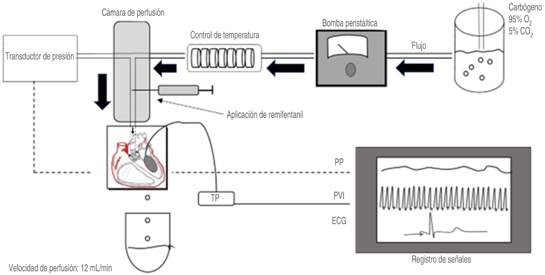 Los procedimientos utilizados fueron aprobados por el comité local para el uso de animales en enseñanza e investigación. Los experimentos se efectuaron en ratas macho de ocho semanas de edad de 200-300 gramos de peso. Se formaron tres grupos experimentales (seis animales por grupo): 1. control sin isquemia-reperfusión, 2. Control con isquemia-reperfusión y 3. Postacondicionamiento con remifentanil (aplicado sólo durante la reperfusión). Los animales se anestesiaron con pentobarbital sódico (60 mg/kg). El corazón se aisló mediante toracotomía y fue conectado a través de la aorta ascendente a un sistema de Langendorff (Figura 1). Este sistema permite mantener la perfusión de las arterias coronarias con una solución con nutrientes, oxigenada y a temperatura de 37 °C que fluye retrógradamente desde la aorta. El corazón conectado a la bomba peristáltica se perfundió retrógradamente a través de la circulación coronaria con una solución de Krebs-Henseleit con la siguiente composición (mM): NaCl (118), KCl (4.7), CaCl2 (2.0), MgSO4 (1.2), KH2PO4 (1.2), EDTA (0.5), NaHCO3 (25), glucosa (11). La solución se mantuvo a un pH 7.4 y a una temperatura de 37 °C, con burbujeo constante de una mezcla de 95% de O2 y 5% de CO2 (carbógeno). La velocidad de perfusión se mantuvo a 12 mL/min en todo el experimento, es decir, tanto en el período preisquémico como durante la reperfusión. La isquemia global se produjo deteniendo la perfusión durante 30 min. Un balón de látex conectado a un transductor tipo Grass se introdujo al ventrículo izquierdo a través de la válvula mitral para registrar la presión ventricular izquierda (PVI). Dos electrodos de estimulación se colocaron en la orejuela derecha con lo que se controló la frecuencia cardíaca (FC) a 312-324 pulsos por minuto (ppm). Con los datos de PVI y de FC se calculó el trabajo cardíaco (TC) mediante la siguiente relación: TC = PVI × FC (mmHg/ppm). El remifentanil se aplicó (100 ng/mL) desde el inicio de la reperfusión y se aumentó progresivamente la dosis para estudiar su efecto sobre la reperfusión del corazón de la rata.