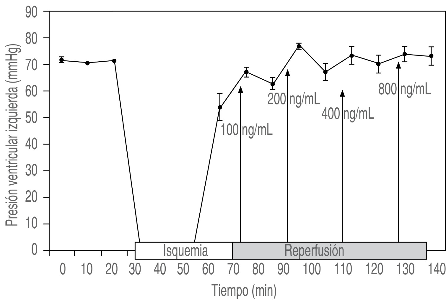 El remifentanil se aplicó desde el inicio de la reperfusión del corazón aislado a dosis crecientes para estudiar el efecto sobre la PVI durante la reperfusión. En la Figura 2 se presenta la curva dosis-respuesta a partir de 100 ng/mL.