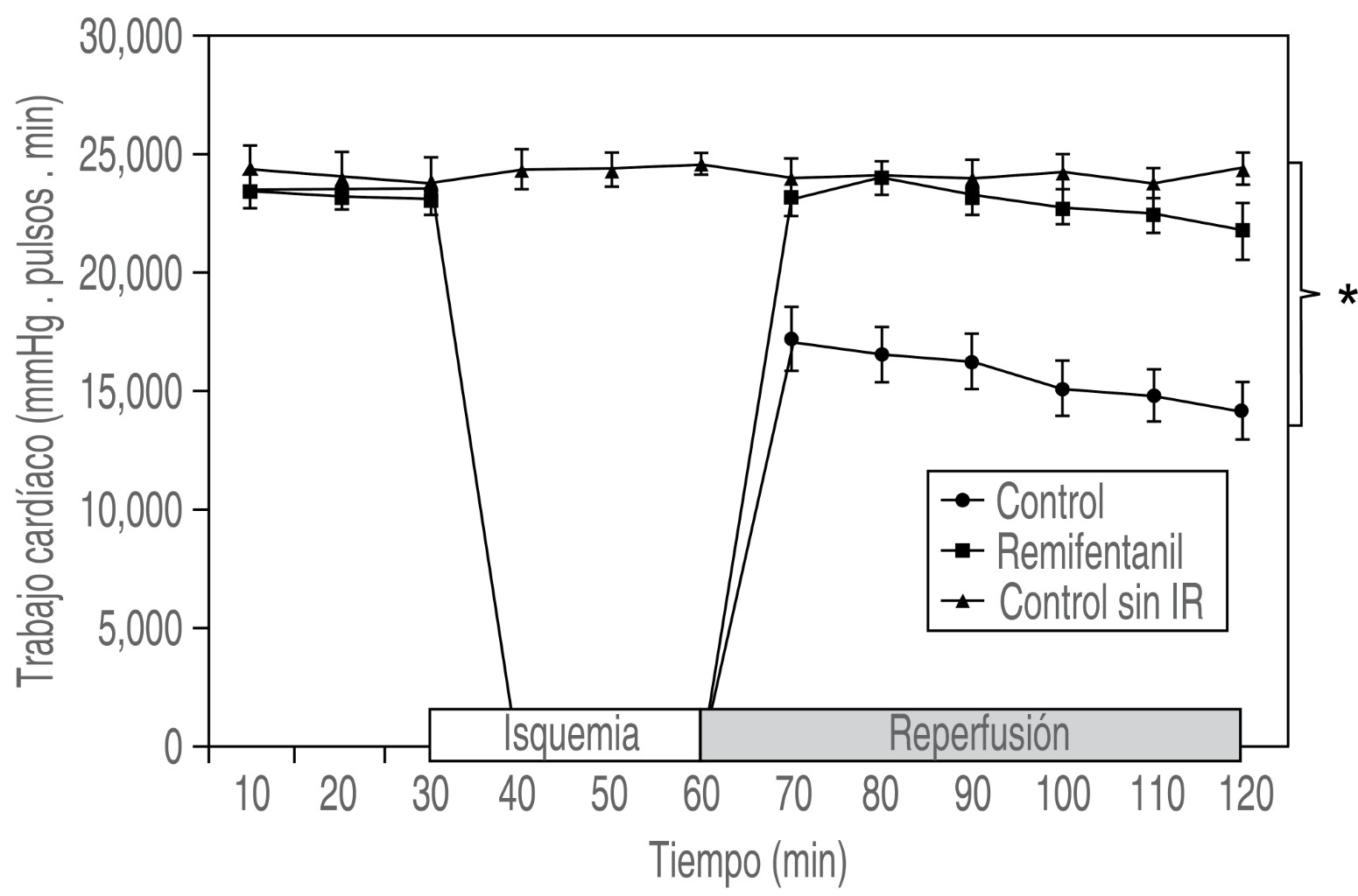 La isquemia miocárdica perioperatoria es un evento observado durante la cirugía en pacientes de alto riesgo y aumenta significativamente la morbimortalidad postoperatoria. El corazón puede tolerar los efectos de la lesión aguda por la isquemia-reperfusión (I/R) si se aplican varios ciclos cortos de I/R previos a la isquemia miocárdica sostenida. Esta estrategia cardioprotectora puede ser usada previamente (preacondicionamiento isquémico) o posteriormente (postacondicionamiento isquémico) al período de isquemia sostenida letal. El condicionamiento farmacológico consiste en el uso de fármacos para obtener efectos cardioprotectores similares al condicionamiento isquémico. Los opioides se han utilizado en el condicionamiento farmacológico, en particular el remifentanil es el más extensamente estudiado en la cardioprotección. Estudios previos demuestran que protege contra el daño por la I/R aplicándolo pre, trans y postreperfusión tanto en estudios experimentales como en la práctica clínica. En este trabajo se estudia el postacondicionamiento inducido con remifentanil en el modelo de Langendorff de corazón aislado y perfundido de rata. Este modelo permite reproducir la isquemia miocárdica en el corazón aislado de un animal anestesiado. Las variables registradas fueron: presión intraventricular izquierda (PVI), frecuencia cardíaca (FC) y actividad contráctil del corazón expresada como el trabajo cardíaco (TC = PVI × FC). La isquemia se produjo al suspender la perfusión de la solución Krebs-Henseleit durante 30 minutos, posteriormente se estableció la reperfusión durante dos horas, observándose la respuesta del corazón aislado en las diferentes condiciones. En los corazones control con I/R, el TC disminuyó un 40%. Por otro lado, el remifentanil recuperó los niveles basales de TC del control sin I/R, demostrando su efecto cardioprotector.ABREVIATURAS: