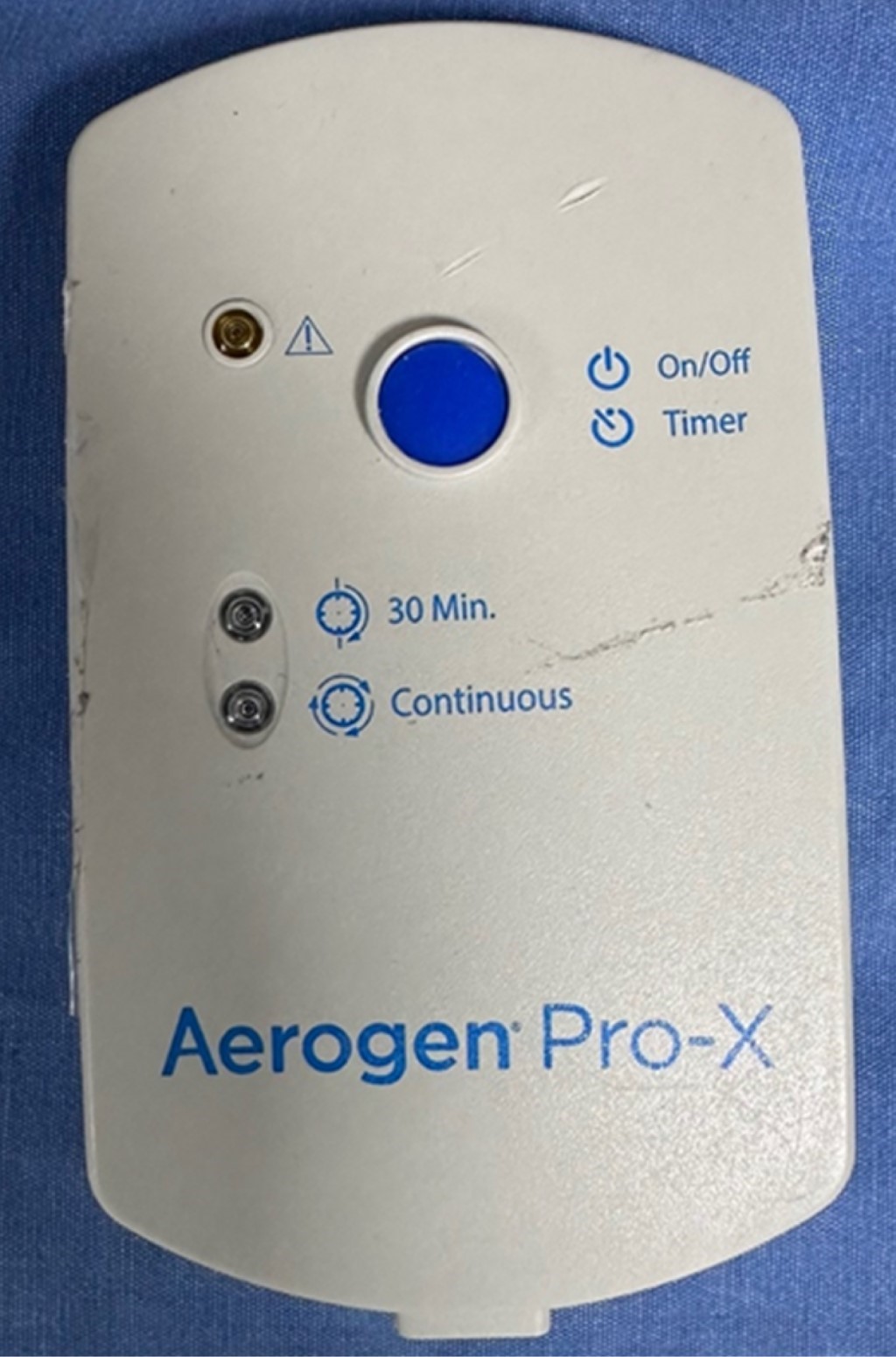 Al término del evento, se procedió a realizar la nebulización de ropivacaína al 0.2% 10 mg (5 mL), mediante dispositivo Aerogen (Figura 1) durante cinco minutos (Figura 2), posterior a lo cual se inicia cierre de incisiones de los puertos quirúrgicos.