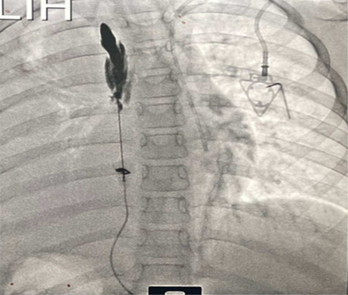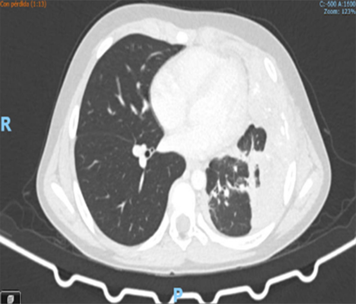 Masculino de siete años de edad, 30 kg de peso y 132 cm de talla, con diagnóstico de sarcoma de Ewing pleural izquierdo con compromiso de arcos costales 5, 6 y 7 izquierdos, con compromiso pleural y pericárdico, sin otros antecedentes de interés. Había recibido quimioterapia sistémica. El paciente ingresa el 01/10/2022 a urgencias por dolor de tipo pleurítico, sin asociarse a síntomas respiratorios. La tomografía axial computarizada (TAC) de tórax evidencia neoplasia infiltrativa de la pared del hemitórax izquierdo con extensión al hemidiafragma ipsilateral, pericardio, pleura parietal y visceral (Figura 1). En la resonancia magnética de tórax se encontraron nódulos aislados pleurales posteriores apicales izquierdos en relación con compromiso metastásico pulmonar. Desde el punto de vista oncológico, se determinó progresión de la enfermedad; por dolor severo del paciente, se consideró realizar neurólisis del plano del músculo erector de la espina, para lo cual se mantuvo al paciente con morfina 2 mg IV cada cuatro horas y rescates de 1 mg IV hasta cuatro en 24 horas en caso de dolor severo previo al procedimiento. A 10 días del ingreso a urgencias, el paciente fue llevado a manejo intervencionista del dolor; en decúbito prono, bajo previa asepsia y antisepsia, se realiza lavado quirúrgico, colocación de campos estériles, mediante guía ecográfica y fluoroscopía se identifican planos de apófisis espinosas torácicas (Figura 2), se situó central apófisis espinosa de T4, lateral a ella se identificó lámina y luego apófisis transversa con imagen en plano. Bajo anestesia general, se llevó la aguja a cuerpo de apófisis transversa y se colocó volumen de 20 cm3 en el plano del erector de la espina, identificando elevación del erector de la espina (Figura 3). No se presentaron complicaciones. Se realizó neurólisis unilateral del plano erector de la espina T4 izquierda con mezcla analgésica: 6 cm3 de alcohol al 99% + 4 cm3 de solución salina al 0.9% + 5 cm3 de bupivacaína al 0.5% sin epinefrina. Con adecuado control de dolor, posterior a procedimiento con FLACC (Face, Legs, Activity, Cry, Consolability) de 0, no requirió uso de rescate de opioides potentes, no presentó dolor incidental ni irruptivo y tuvo adecuado patrón de sueño. Posterior a esto, recibe radioterapia externa conformacional con intención paliativa. Dos días después del procedimiento, paciente con FLACC de 2 y al siguiente 0 con disminución del consumo analgésico. Por adecuada evolución clínica, se da egreso el 14/10/2022. Al mes control con adecuada evolución y FLACC de 0.