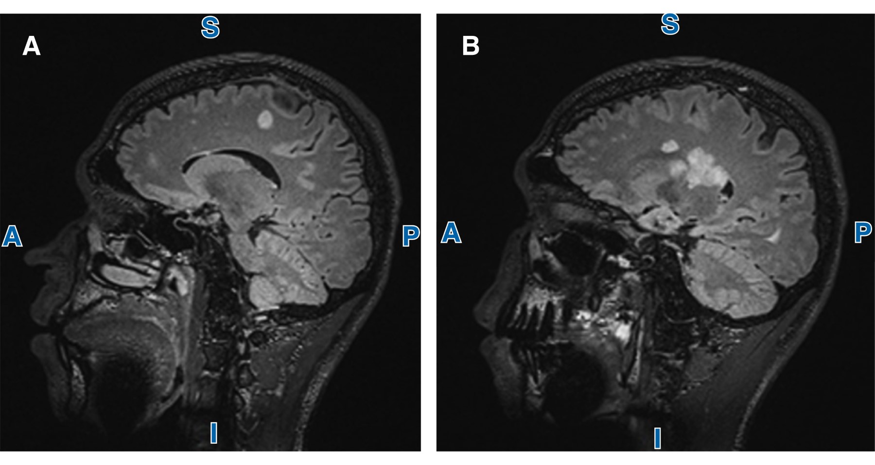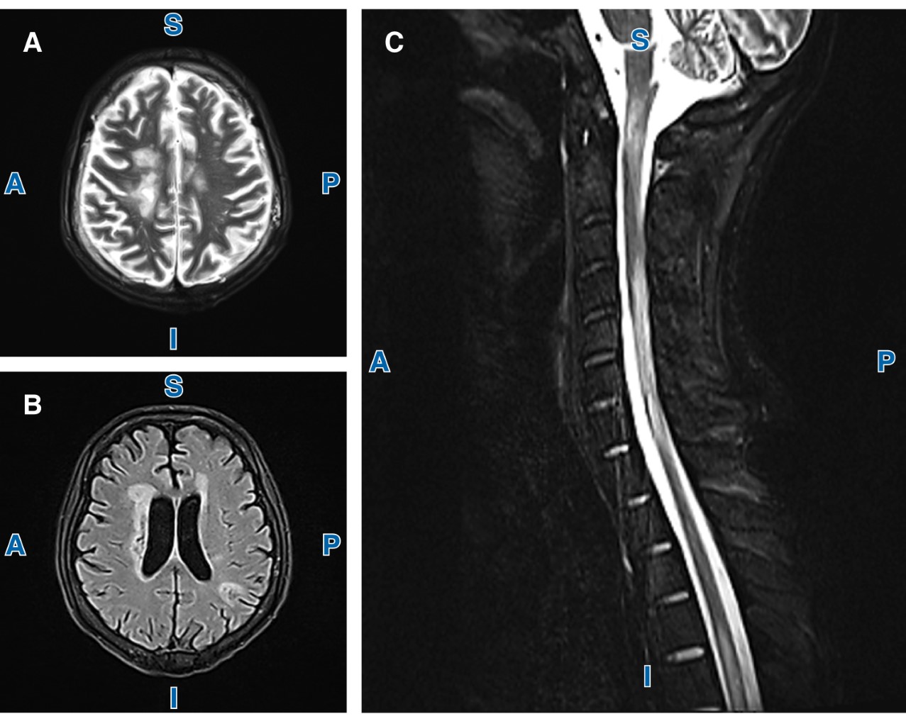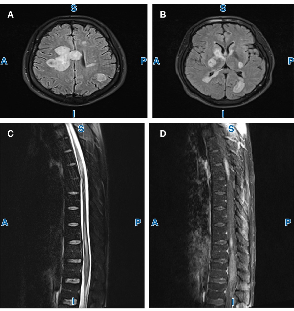 A las tres semanas del inicio de los síntomas se realizó una segunda IRM que mostró progresión de la actividad inflamatoria de forma severa, con presencia de lesiones intraaxiales ovoideas y confluentes supratentoriales e infratentoriales en cuerpo calloso a nivel de la corona radiada, en sustancia blanca periventricular a nivel frontotemporal, subcortical temporoparietal y occipital y oliva bulbar derecha, además de lesiones intramedulares (Figura 2).