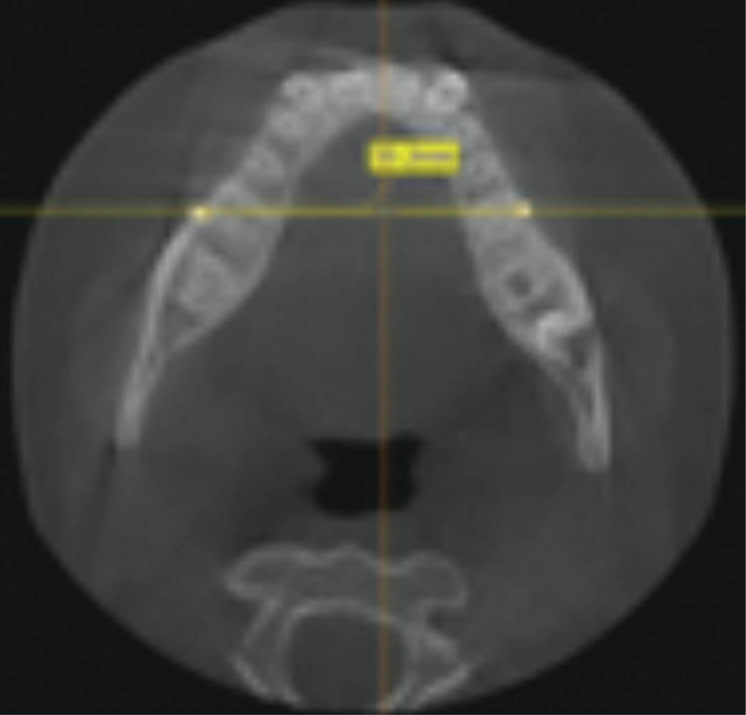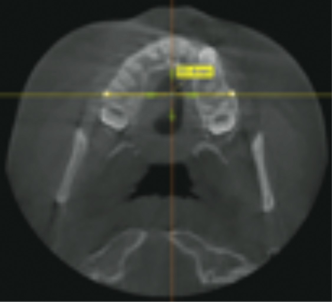 Para obtener la medida de referencia mandibular, en un corte coronal se colocó una línea de referencia horizontal a nivel de la bifurcación de primeros molares y en el corte axial se realizó la medición desde la cortical vestibular derecha a la izquierda para la mandíbula (Ag-Ag). Se consideró como caso de colapso maxilar cuando la discrepancia entre la medida transversal del maxilar y la mandíbula fue menor a 5 mm (Figuras 1 y 2).