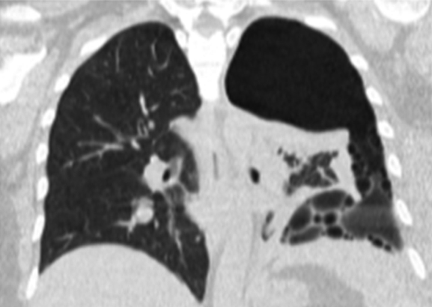 Nuestra paciente fue tratada con metronidazol 500 mg vía intravenosa cada ocho horas, ceftriaxona 2 g vía intravenosa cada 24 horas, colocación de sonda endopleural y, por último, cirugía de tórax debido a la presencia de pulmón atrapado (Figura 2). Se realizó decorticación de lóbulo superior y adherenciólisis de lóbulo inferior en su cara anterolateral y posteroinferior. El único factor de riesgo encontrado fue la presencia de obesidad, se descartó infección por virus de la inmunodeficiencia humana (VIH) o algún estado de inmunocompromiso. La duración de la terapia antibiótica fue de tres semanas; la paciente fue dada de alta en buenas condiciones generales.