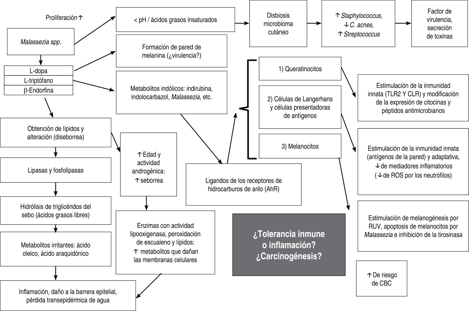 Otros mecanismos que apoyan la teoría de Malassezia en la DS, son la mejoría del cuadro clínico, la inflamación y la densidad de levaduras con la administración de antifúngicos.3,8,12 La pared de Malassezia estimula la inmunidad innata, se producen sustancias indólicas derivadas del triptófano que son fuertes ligandos para los receptores de aril hidrocarburo (AHR) de la piel. Este receptor actúa mediante varias vías. 4,8,12,13 Las lipooxigenasas que peroxidan lípidos, como el escualeno, producen lipoperóxidos que dañan las membranas celulares.6,8 En la Figura 1 se puede ver la complejidad que existe entre Malassezia y sus múltiples interacciones con la etiopatogenia de la DS en el huésped susceptible.