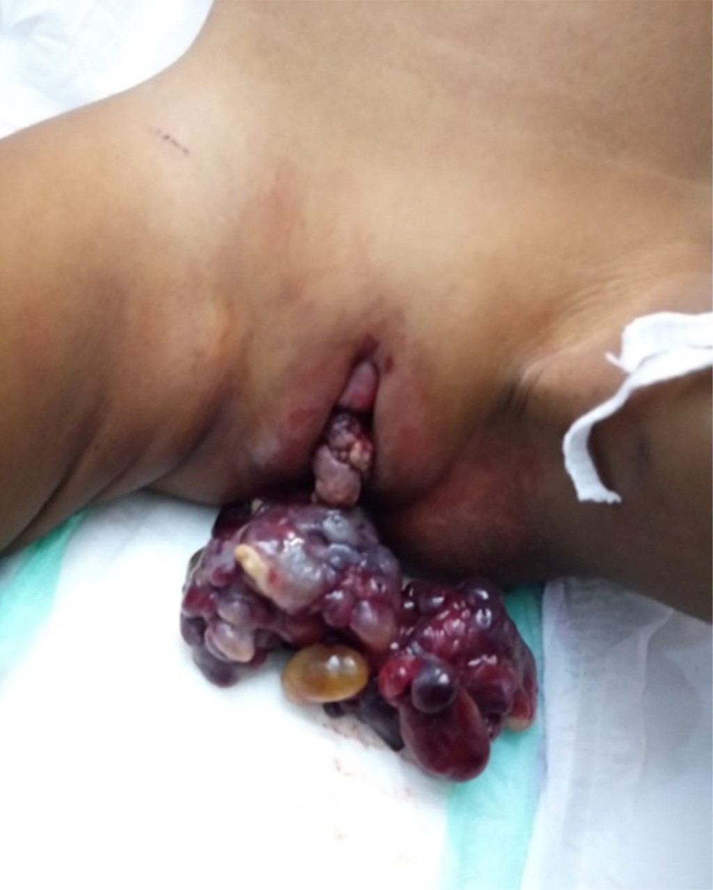 Se solicitó ultrasonido abdominal, en el cual se identificó una masa intravesical hipoecoica con contornos irregulares, que ocasionaba obstrucción de la vía urinaria. Cinco días después, la madre observa una lesión exofítica en región genital de aproximadamente un centímetro de diámetro, color púrpura, la cual protruyó y creció hasta alcanzar de 4 a 5 cm de diámetro (Figuras 1 y 2).
