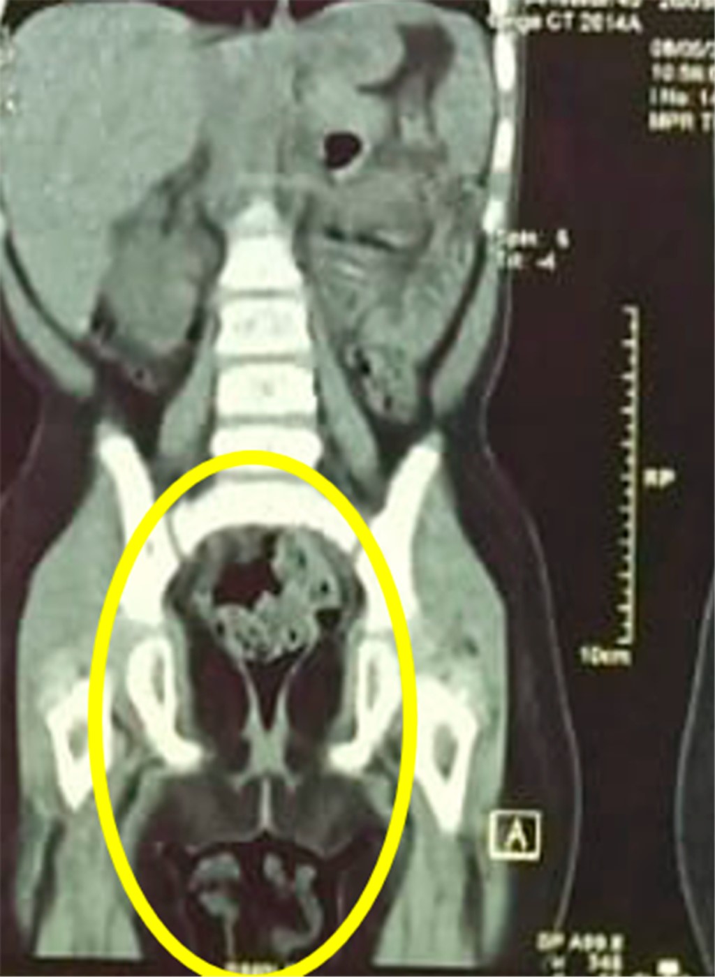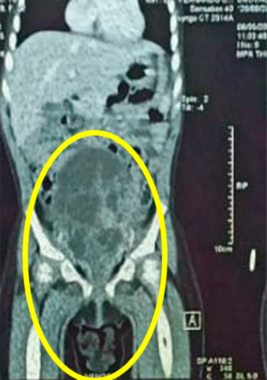 Paciente femenino de 2 años 10 meses, sin antecedentes de importancia. En consulta externa de pediatría se revisó por sintomatología de dos meses de evolución con disuria, dolor abdominal, hematuria, fiebre, así como de eritema con edema perivulvar. Para ese momento, la paciente ya había recibido varios esquemas de antibióticos por parte de médico general. Pero ante la persistencia de la sintomatología se tomó urocultivo, con aislamiento de Pseudomonas aeruginosa; sin embargo, tres días posterior al inicio del tratamiento antibiótico, continuó con fiebre, disuria y distensión abdominal.