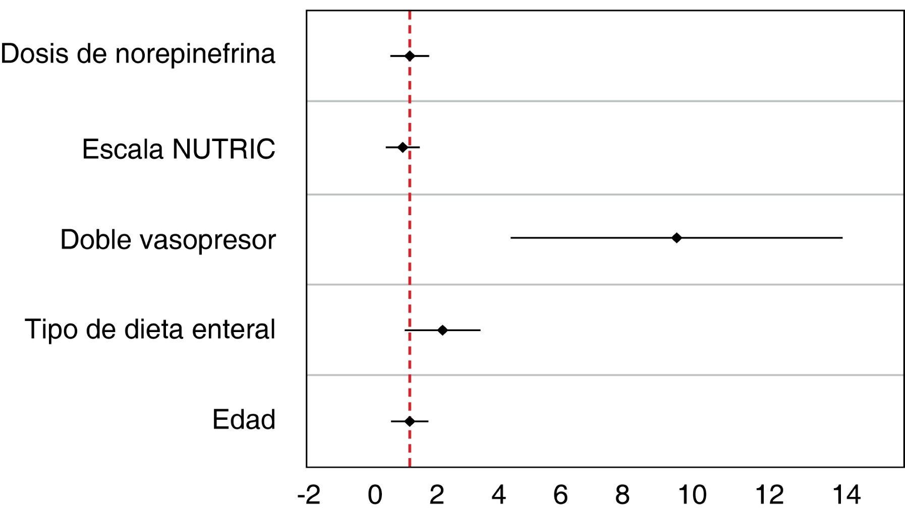 En el análisis de regresión múltiple (edad, tipo de dieta enteral, doble vasopresor, escala NUTRIC y dosis de norepinefrina), el uso de doble vasopresor fue la única variable que más probabilidad tiene de presentar intolerancia a la dieta enteral (OR 8.9, IC95% 2.20-12.14) (Figura 1).