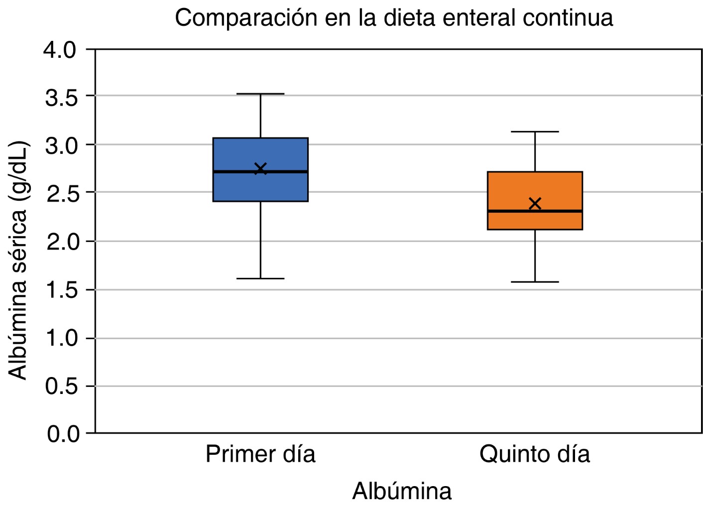 Finalmente, al analizar los marcadores bioquímicos nutricionales, se observó una disminución en los niveles de albúmina al quinto día en los dos grupos, siendo estadísticamente significativo en el grupo de dieta enteral continua (2.7 a 2.3 g/dL, p = 0.001) (Figura 2).
