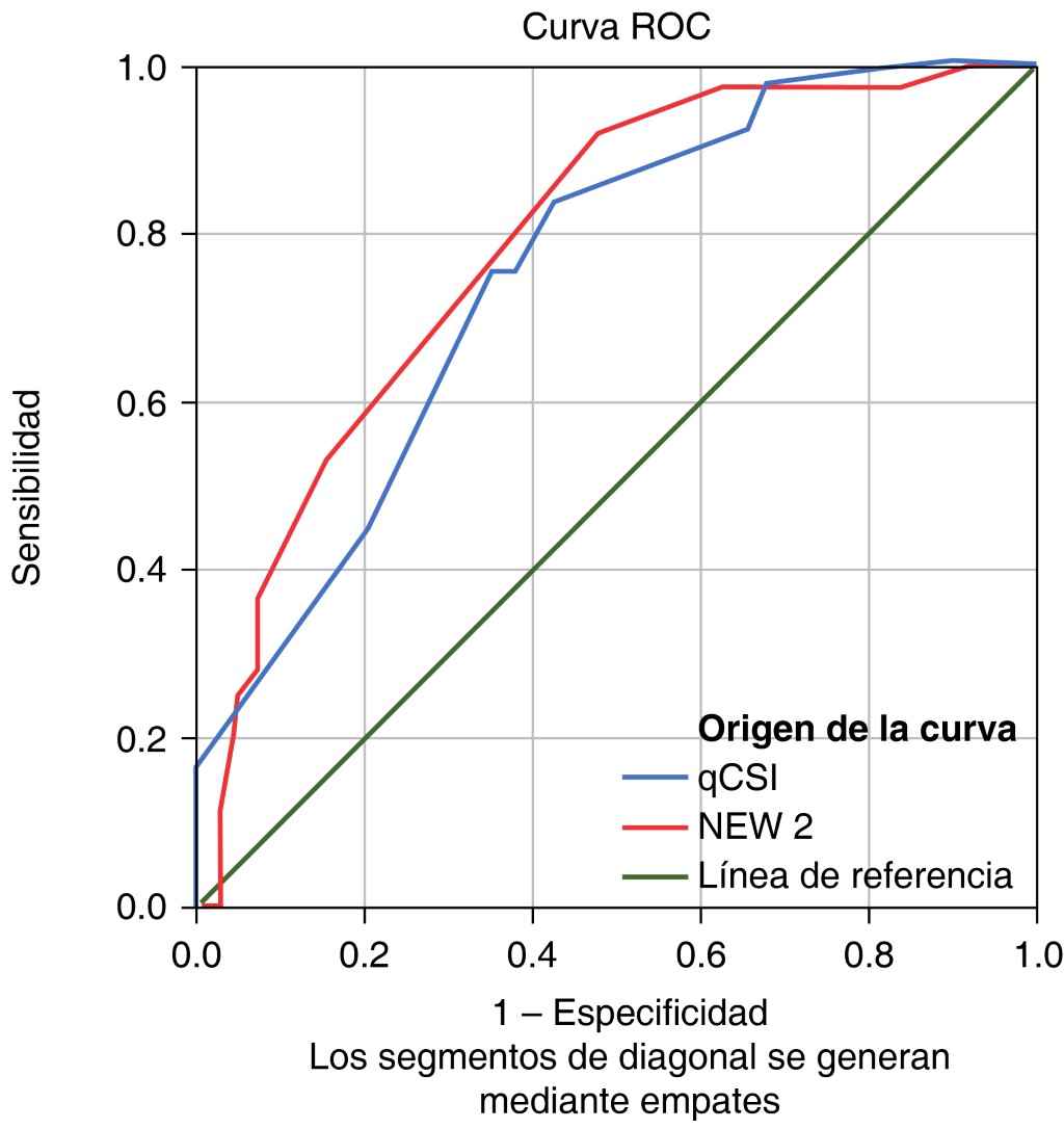 NEWS 2 presentó una sensibilidad de 63% y una especificidad de 25%, mientras que qCSI contó una mayor sensibilidad de 83% y una especificidad de 42.5% al presentar un valor de score mayor a 7.5 (Tabla 2).