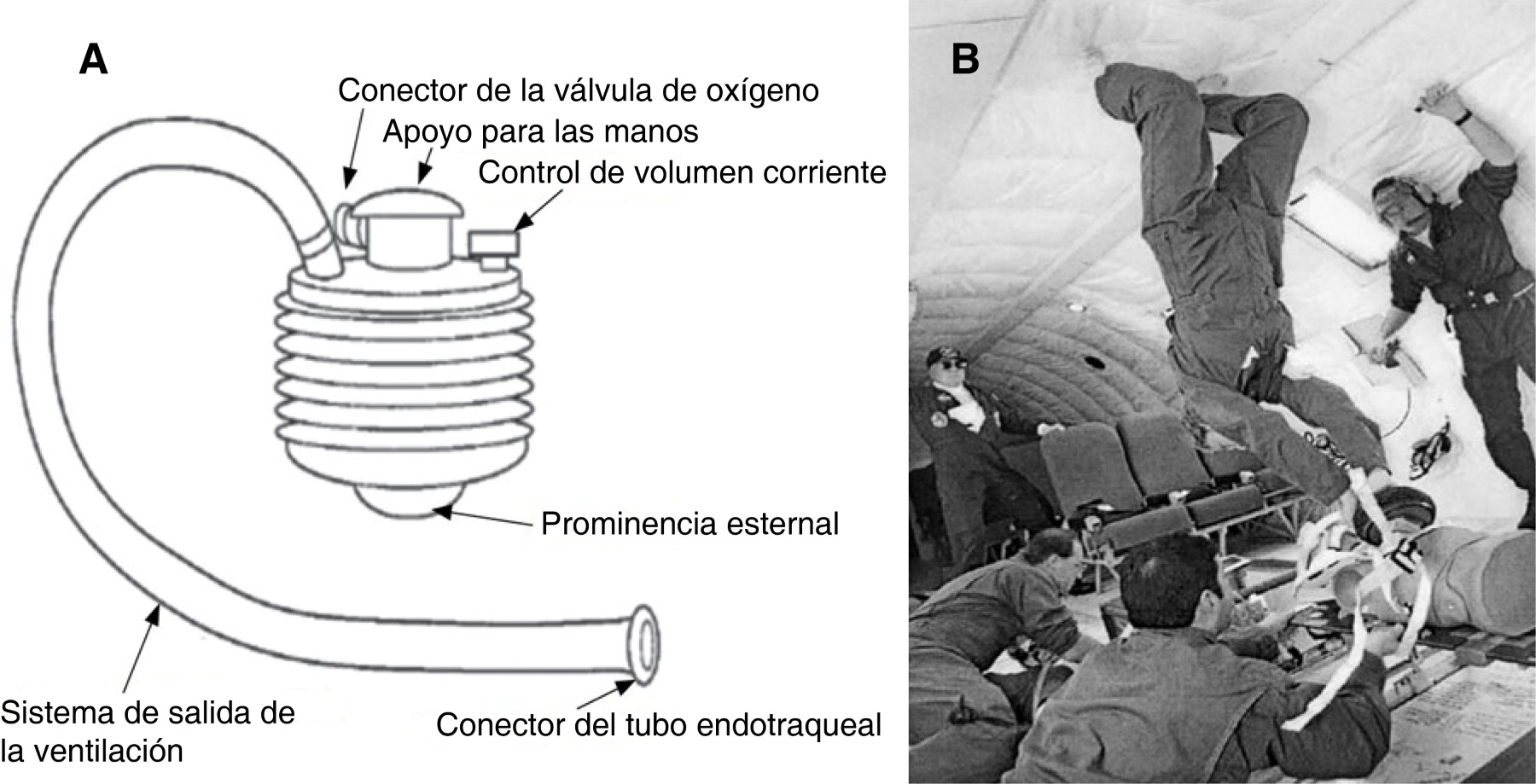 En el año 2003, el Dr. Gregory Jay y colaboradores compararon cuatro métodos para otorgar RCP en ambiente simulado de microgravedad (realizado en vuelo parabólico a bordo de un avión KC-135). Las técnicas fueron el método lateral convencional, la maniobra a horcajadas alrededor de la cintura, el método vertical sobre las manos y la maniobra de Heimlich modificada (ver más adelante).9 El elemento adicional del estudio fue la utilización de un dispositivo mecánico adjunto en forma de fuelle que al colocarse sobre el tórax para dar compresiones permitía, también, derivar un volumen de aire que se dirigía a la vía respiratoria del paciente, cumpliendo así la función de un "ventilador" manual (Figura 3).6