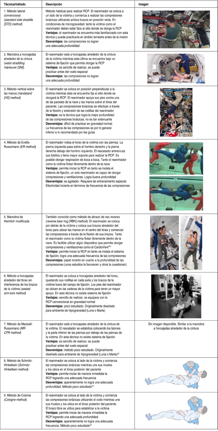 Con base en las investigaciones realizadas en vuelos parabólicos, misiones espaciales y laboratorios terrestres, hoy día contamos con nueve técnicas o métodos para efectuar RCP en ambiente de microgravedad e hipogravedad. Las características de cada una de ellas se resumen en la Figura 6.