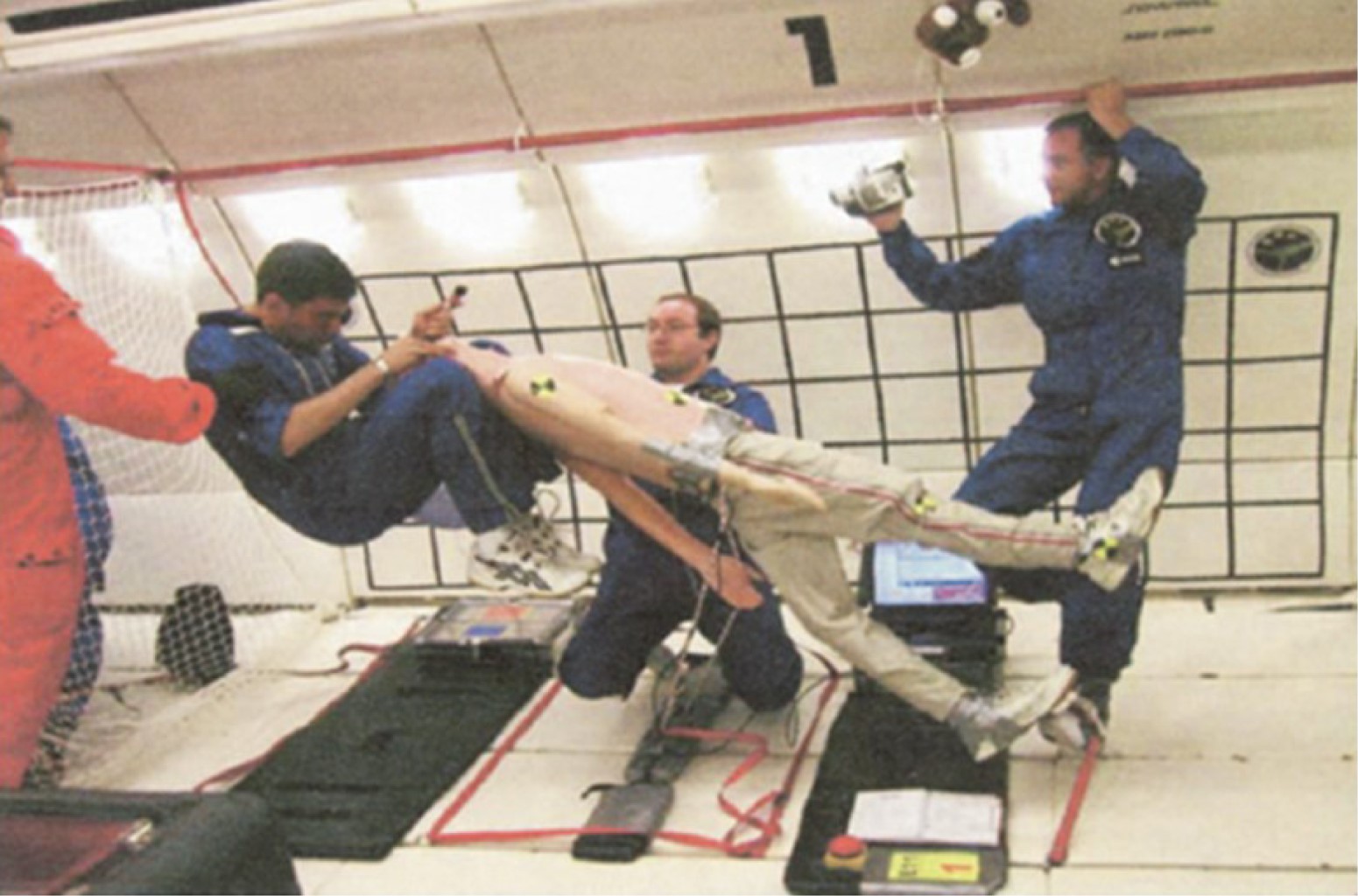 A partir del año 2010 comienza la investigación en laboratorios terrestres, utilizando los dispositivos de suspensión corporal que permiten simular la microgravedad y también la denominada hipogravedad (p. ej. la luna tiene una gravedad de 0.16 G y el planeta Marte 0.38 G). La microgravedad e hipogravedad se logran simular suspendiendo al reanimador a través de cables y contrapesos cuyo efecto se calcula de acuerdo con fórmulas específicas (Figura 5).
