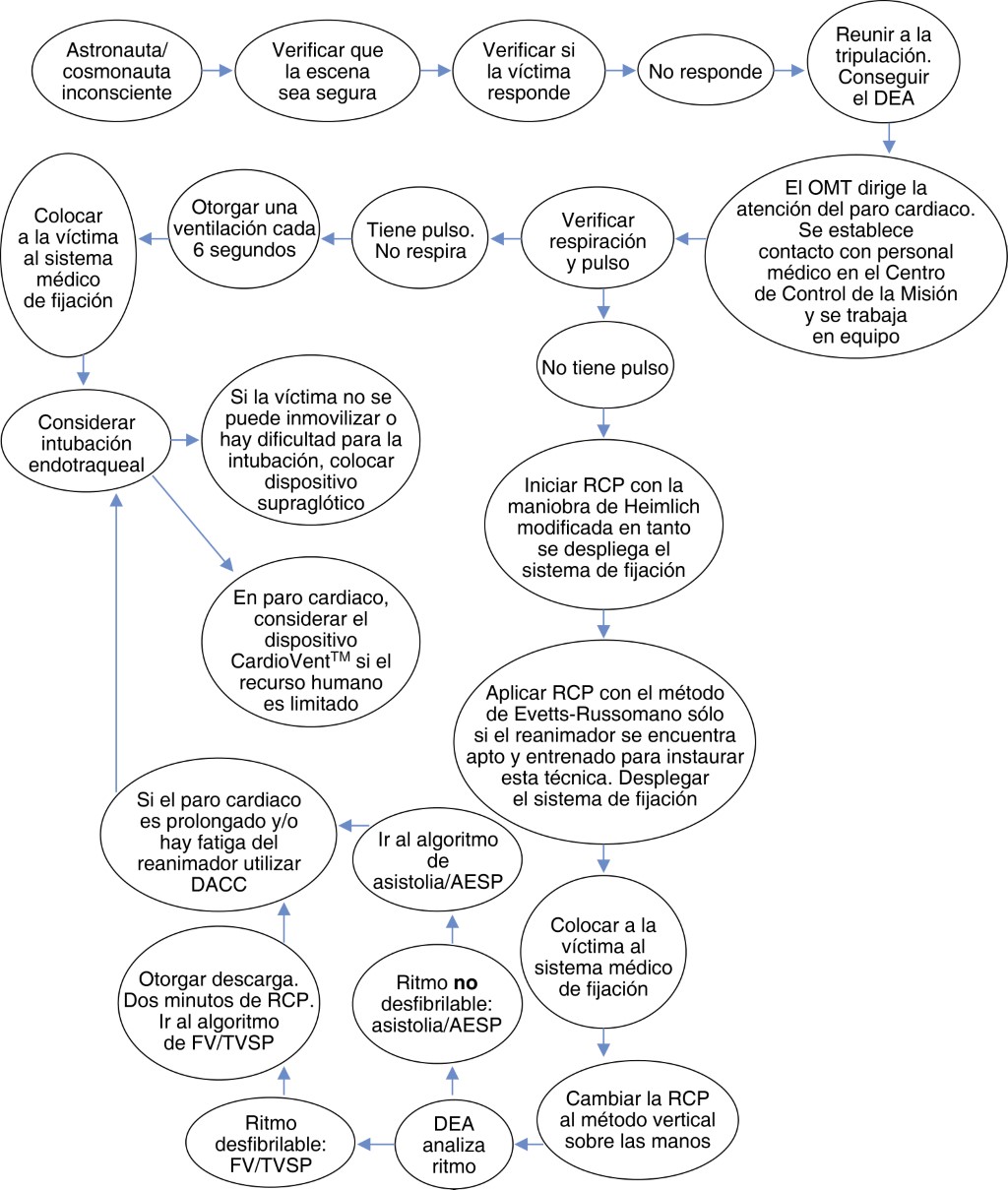 En el año 2016, y con base en las investigaciones llevadas a cabo desde 1990, se publicó, en el primer libro de Medicina Espacial en México, un algoritmo de manejo de RCP en microgravedad, el cual sigue vigente a la luz de las nuevas publicaciones sobre el tema (Figura 9).6 En el año 2020 se publicaron las Guías de Reanimación Cardiopulmonar durante Vuelo Espacial de la Sociedad Alemana de Medicina Aeroespacial y de la Sociedad Europea de Medicina Aeroespacial.28 Tanto el libro de Medicina Espacial como las guías alemanas (y también el presente artículo), brindan las bases científicas para aplicar la RCP en el entorno microgravitatorio.