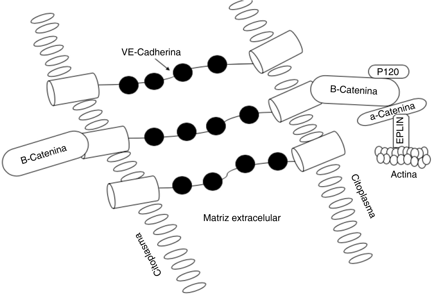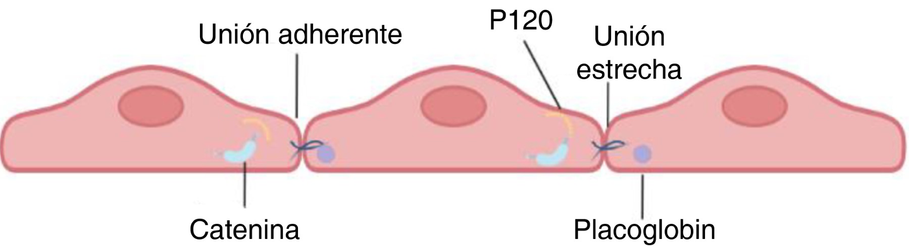 Hay dos subtipos de uniones intercelulares: las uniones apretadas o "zona ocludens" y las uniones adherentes o "zona adherens". En las uniones apretadas las principales proteínas son las claudinas, las ocludinas y las moléculas JAMs. En las uniones adherentes se cuenta sólo una proteína transmembrana, VE-Cadherina9 (Figura 2).