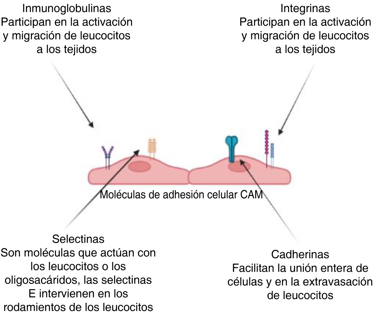 Las moléculas de adhesión celular (CAM) se dividen en cuatro subgrupos diferentes: inmunoglobulinas, integrinas, selectinas y cadherinas. Dentro de las inmunoglobulinas existen las moléculas de adhesión intracelular (ICAM-1 e ICAM-2), las cuales participan en la activación y migración de leucocitos a los tejidos. Las integrinas tienen dos subunidades: alfa y beta, y están presentes entre las células endoteliales. Las selectinas son moléculas que interactúan con los leucocitos o con los oligosacáridos. Las selectinas E intervienen cuando las citoquinas inflamatorias están activadas, tomando protagonismo en el rodamiento de los leucocitos. Por su parte, las cadherinas facilitan la unión entre las células o bien en la extravasación de leucocitos (Figura 4).