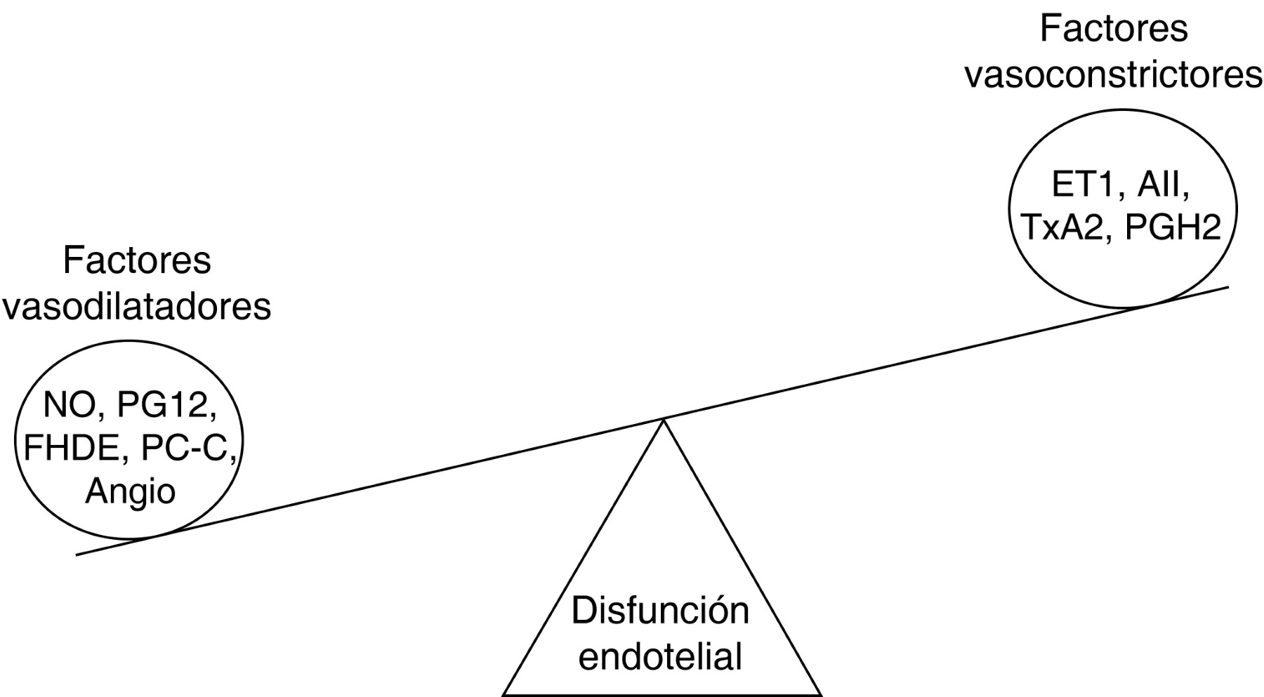 La disfunción endotelial comprende una pérdida del balance entre los factores vasodilatadores y vasoconstrictores derivados del endotelio, donde el estado vasoconstrictor llega a ser dominante, llevando a cambios fisiopatológicos progresivos. Colectivamente, estos cambios endoteliales exhiben características proinflamatorias, prooxidantes, proliferativas, procoagulantes y de adhesión vascular13 (Figura 6).
