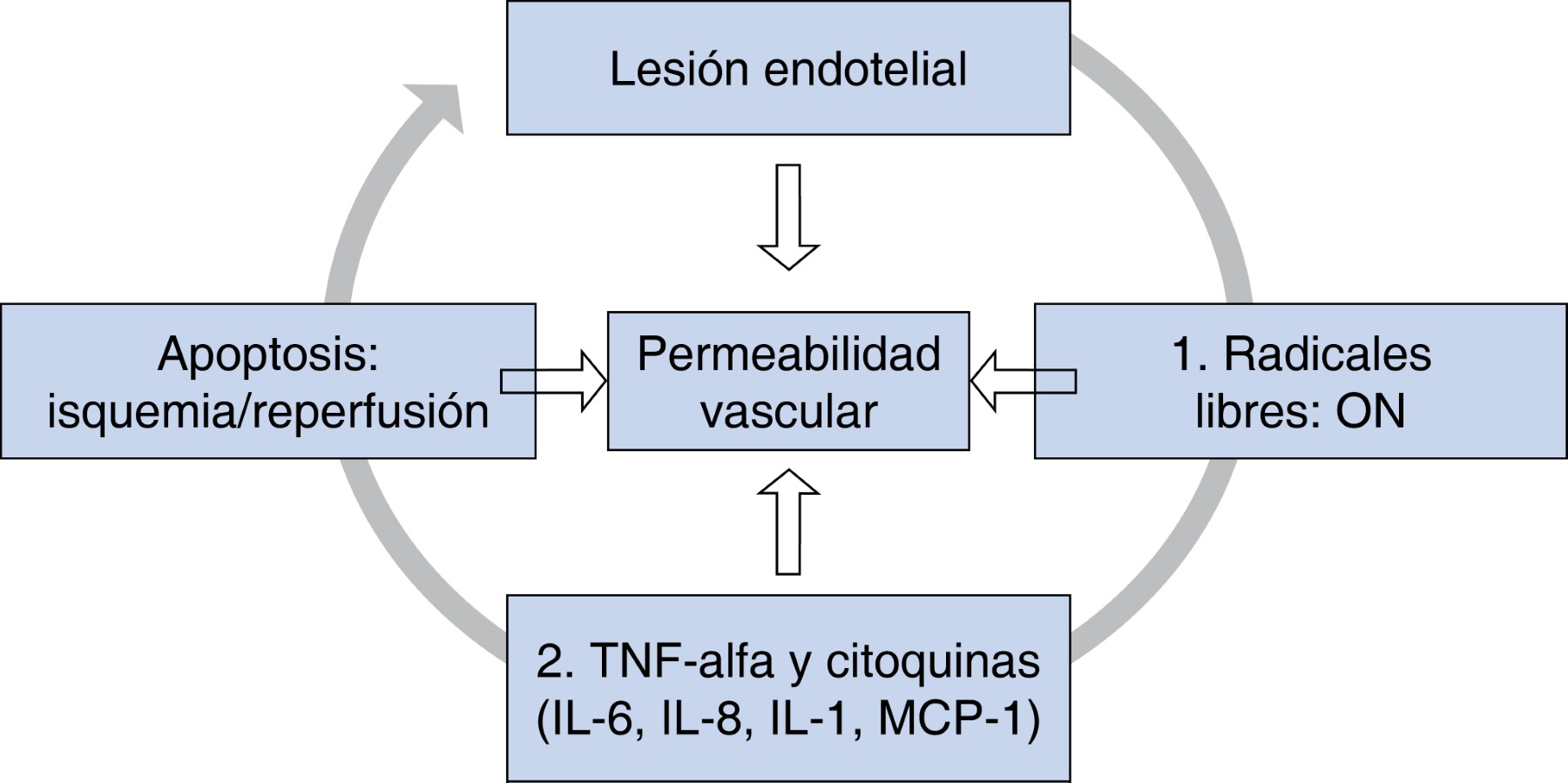 La lesión sobre el endotelio estimula la expresión de moléculas de adhesión que interactúan con los polimorfonucleares y las plaquetas, permitiendo infiltración subendotelial, así como atrapamiento en la microvasculatura, facilitando la vasoconstricción, el edema endotelial y la disminución de la flexibilidad de la membrana celular.14