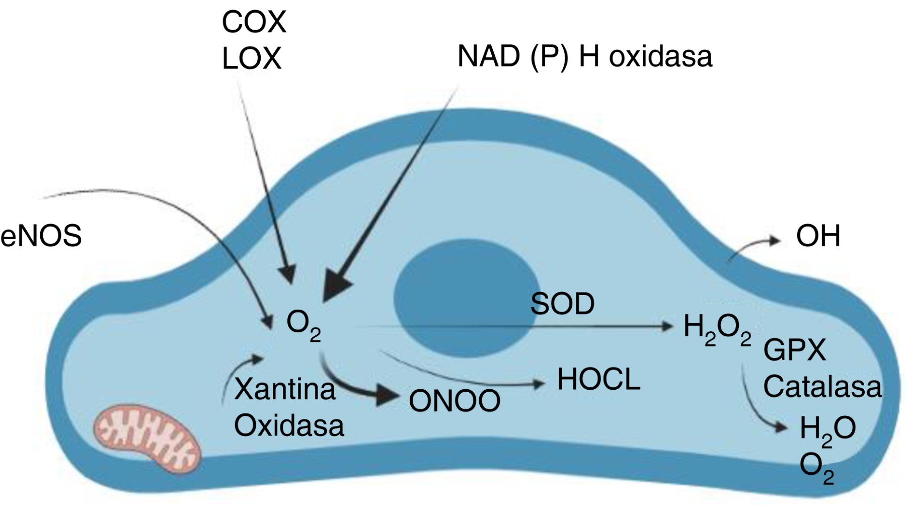 La reducción de óxido nítrico no siempre estará asociada a un proceso benéfico de vasodilatación. Cantidades liberadas bajo la acción de la óxido nítrico sintetasa inducible (iNOS) pueden ser lesivas, pues su liberación es traída y al combinarse con el anión superóxido favorecen la producción de peroxinitrito, que actúa como un poderoso oxidante (Figura 8).14