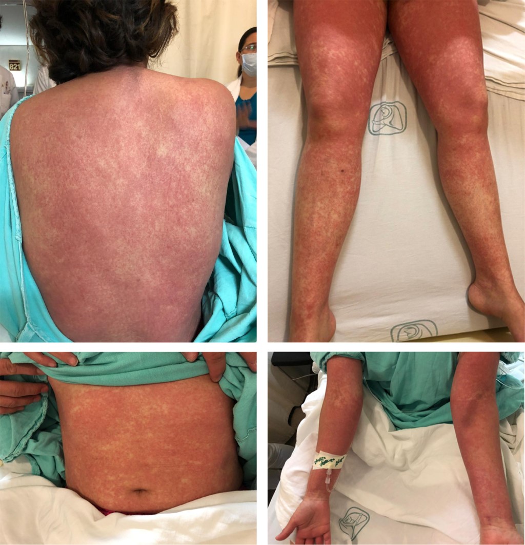 El rash maculopapular generalmente es pruriginoso y evoluciona a la eritrodermia con descamación. Puede asociarse con pústulas estériles tanto foliculares como no foliculares o bulas, y en algunos casos hay involucro de mucosas.10