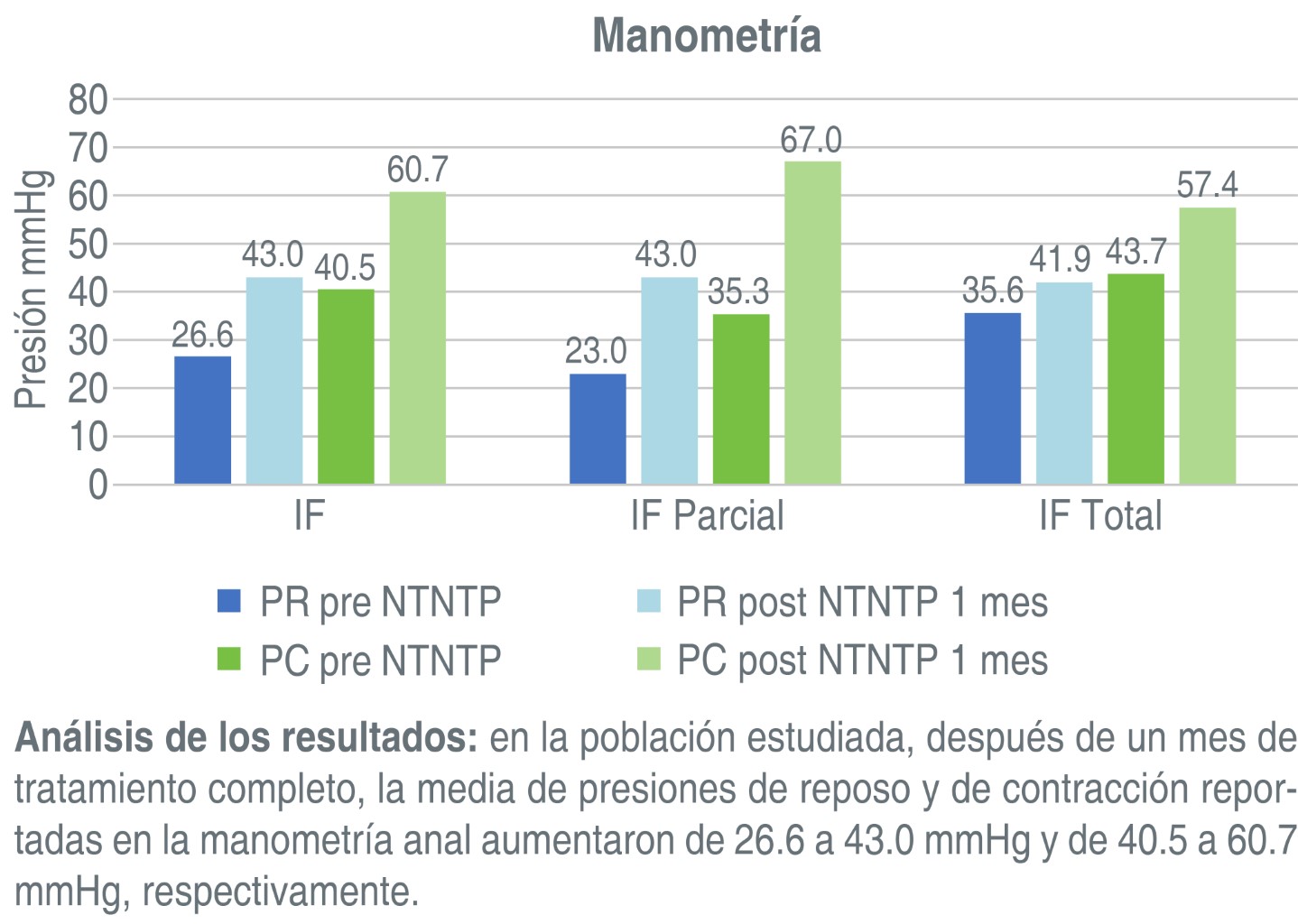Otro punto que se debate en la literatura es la realización de estudios manométricos comparativos posterior a la neuromodulación. Por esto decidimos evaluar parámetros manométricos (presión de reposo y contracción) antes y después del tratamiento.8,10,16,20,32,33 Los valores obtenidos en la presión de reposo y presión de contracción en nuestro estudio aumentaron de 26.6 a 43.0 y de 40.5 a 60.7 mmHg, respectivamente, al mes de haber finalizado la NTNTP, con significancia estadística (p < 0.001) y este aumento también lo vemos reflejado cuando evaluamos los subtipos de incontinencia fecal. Los trabajos descritos sin duda son contradictorios. En 2003, Shafik reportó mejoría en los valores manométricos. En 2009, De la Portilla demostró aumento en la presión de contracción en los pacientes que mejoraron clínicamente. Por otro lado, Queralto y colegas refieren que las variaciones manométricas no son estadísticamente significativas.16,33