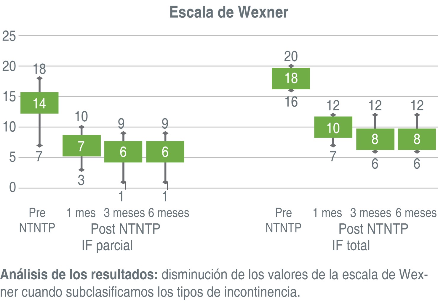 Posterior al tratamiento con la NTNTP, se demostró mejoría de los síntomas clínicos, disminución de los episodios de incontinencia y mejoría en la calidad de vida de los pacientes hasta el corte de nuestro estudio preliminar. Esto se vio reflejado en los resultados que obtuvimos en la disminución de la escala de Wexner y aumento en la de calidad de vida, similar a varios estudios publicados en la literatura.