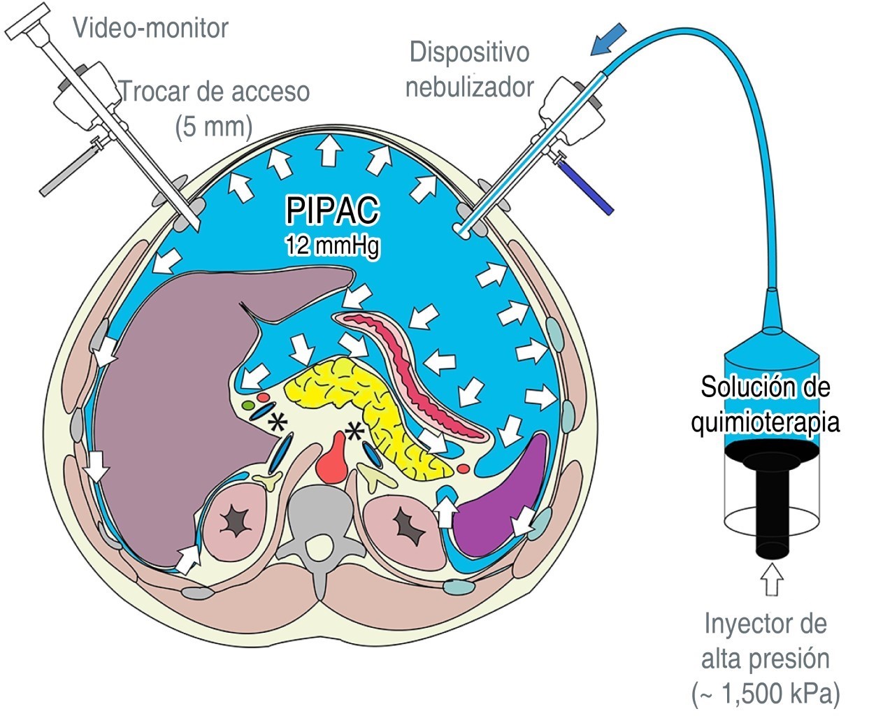 La quimioterapia intraperitoneal por aerosol presurizado PIPAC es un procedimiento que distribuye la solución de quimioterapia (QMT) en forma de microgotas pulverizadas dentro de la cavidad abdominal (spraying), gracias a un abordaje laparoscópico, a través de dos trocares, uno de ellos umbilical por el cual se instala un dispositivo aerosolizador específico.
