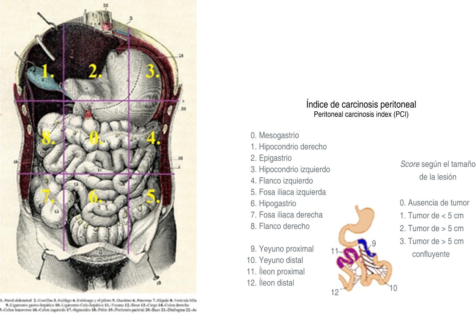El segundo gesto quirúrgico consiste en realizar la cuantificación y evaluación de la carcinomatosis peritoneal. Deberá observarse y cuantificarse la distribución y el tamaño de las lesiones peritoneales, siguiendo un mapeo o cartografía de las lesiones propuesto por el método del índice de carcinomatosis peritoneal (del inglés PCI: Peritoneal Cancer Index), descrito inicialmente por Jaquet y Sugarbaker, quienes establecieron que debían explorarse las 13 regiones anatomotopográficas de la cavidad abdominal18,19,25,26 (Figura 4).