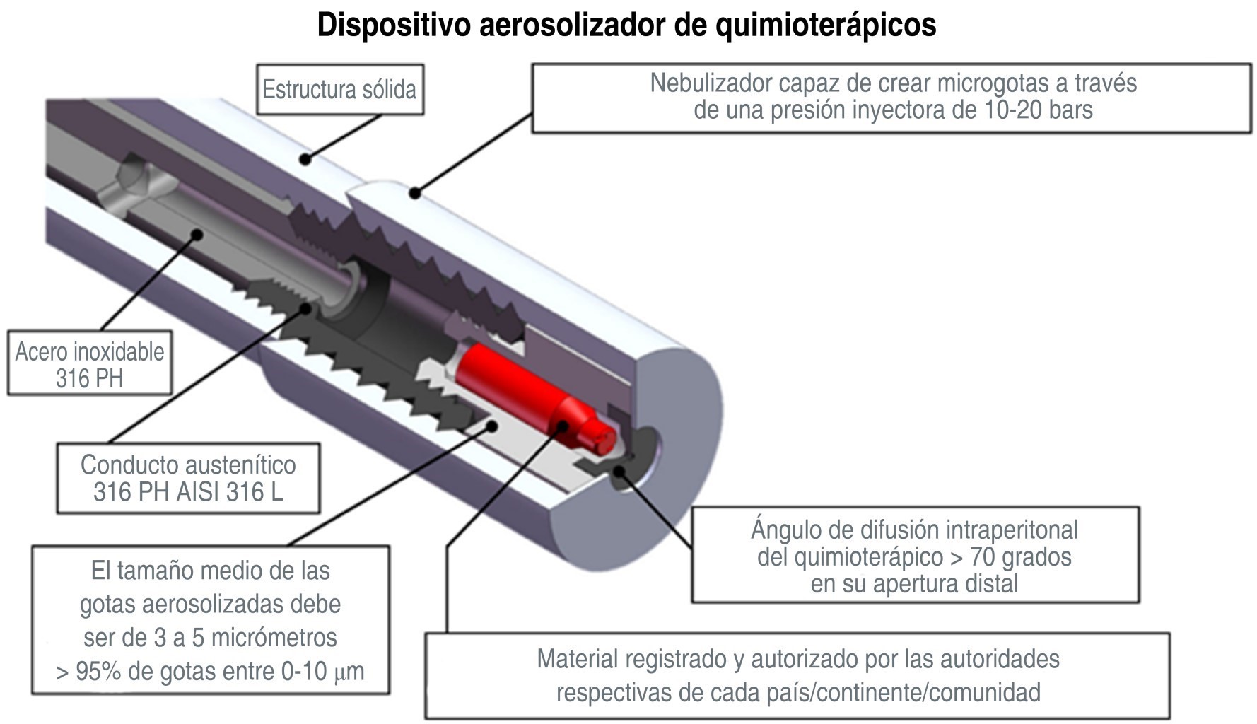 Existen diferentes tipos de aerosolizadores producidos por diferentes fabricantes, cada fabricante defiende las virtudes de su propio producto. Para obtener un buen procedimiento PIPAC,27 deberá escogerse, en términos de material, de las características técnicas y de costos, el más confiable, el que aporte más seguridad, tanto al paciente, al médico como al personal paramédico.3,5-8 Por tal motivo, nosotros utilizamos el dispositivo aerosolizador que tiene la mejor garantía y experiencia de fabricación.