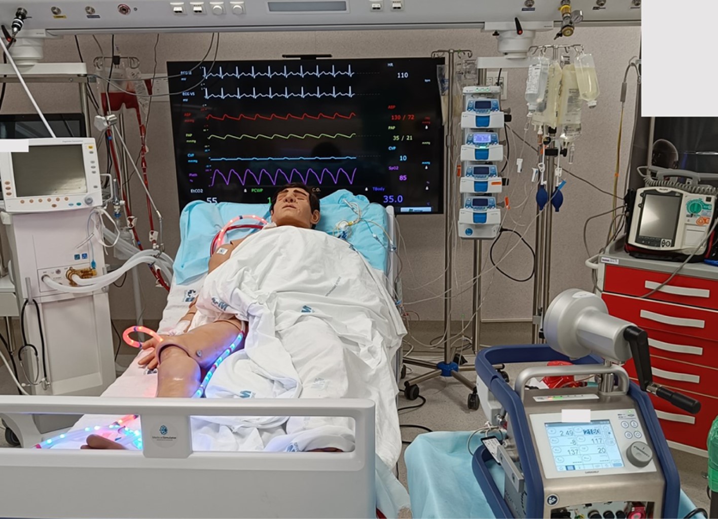 Los talleres de simulación clínica se realizaron utilizando áreas y recursos que recrean escenarios clínicos con un alto nivel de realidad, para mejorar la comprensión y consecución de objetivos marcados. Se conectó un simulador de ECMO (Hybrids VITA© de Medical Simulator o Chalice© de Chalice Medical Ltd) con un maniquí de alta fidelidad (CAE METIman para CAE Ares©), que permitía simular situaciones clínicas críticas, relacionadas con el uso de la ECMO y sus complicaciones. Cada taller clínico se diseñó para conseguir objetivos concretos de manejo clínico, adquisición de habilidades técnicas y no técnicas, como la capacidad de liderazgo del grupo multidisciplinar y manejo de crisis. La interacción del maniquí ("paciente") y el simulador de ECMO fue controlado por un técnico de simulación mediante el software que permite la interacción entre ambos. La monitorización del paciente se registra en un monitor de amplias dimensiones que incluye los parámetros hemodinámicos, respiratorios y electrocardiograma (ECG). Cualquiera de los dos simuladores ECMO permitía la oclusión (ajustable) de las líneas de extracción y/o retorno para simular las situaciones clínicas. Como dispositivo ECMO se utilizó el sistema CardioHelp© (Getinge). Este dispositivo mueve el flujo mediante bomba centrífuga, tiene la capacidad de proporcionar el flujo conseguido de la bomba en las circunstancias clínicas reales y las presiones tanto de extracción, como las pre y postbomba (P1, P2 y P3, respectivamente). Asimismo, dispone de alarmas (visuales y acústicas) que facilitan el desarrollo de los objetivos del taller al activarse cuando se sobrepasan los límites de flujo y/o presiones programadas. El escenario incluye también un respirador mecánico, un monitor-desfibrilador y sistemas de infusión de fluidos y perfusiones de fármacos (Figura 1).