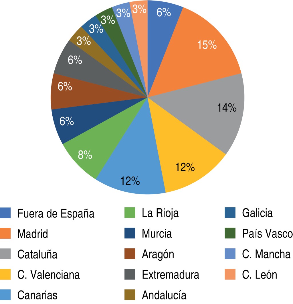 Se analizan los datos obtenidos de un total de 161 alumnos participantes, 57 de ellos pertenecientes a los cursos de modalidad híbrida. Cada curso tuvo entre 24 y 32 alumnos totales y cada taller práctico entre ocho y 10 alumnos. Contestaron el cuestionario de satisfacción 140 alumnos (86.9%). Los alumnos son en su mayoría médicos especialistas de medicina intensiva y anestesiología, pero también participaron cardiólogos, cirujanos cardiacos, perfusionistas y enfermeras (Figura 2). El 71% de los alumnos fueron médicos (9% médicos residentes) y 29% perfusionistas y enfermeras especializadas en el enfermo crítico. Fundamentalmente, los alumnos proceden de todo el territorio español, pero también de Latinoamérica (Colombia, Panamá, Uruguay), Portugal, Italia y Reino Unido (Figura 3).