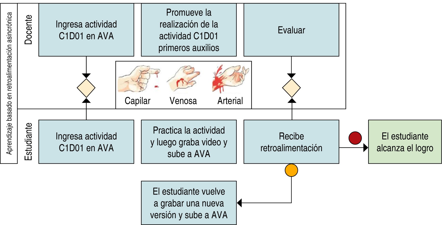 Los estudiantes, al igual que los docentes, acceden a la herramienta C1DO1 por medio de la plataforma AVA (ambiente virtual académico) de Blackboard Ultra, a través de la cual el docente promueve la realización de la actividad y retroalimenta cada una de las entregas de los estudiantes. Los estudiantes, por medio de la grabación de lo requerido en la etapa 1, construirán y demostrarán en forma remota las competencias adquiridas y necesarias para la asignatura de primeros auxilios. Si el estudiante no alcanza el logro del objetivo, recibirá una nueva retroalimentación con un máximo de cuatro entregas (videos), aunque en la práctica un porcentaje de los estudiantes logran las competencias requeridas, a la segunda entrega; lo cual le permite avanzar a la etapa 2; y así una vez alcanzado los objetivos de ésta, como se describió en la etapa 1, se da por finalizada la actividad.