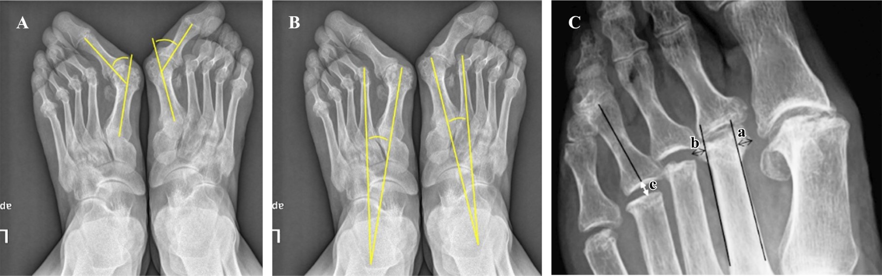 Evaluación radiográfica. Se realizó una evaluación de la luxación de la articulación MTF, el espacio de artroplastía de resección y el tamaño de los osteofitos por remodelación del muñón metatarsal. El espacio de artroplastía de resección se definió como la distancia mínima desde el punto de intersección entre el eje longitudinal y el extremo proximal de la falange proximal hasta el margen distal del muñón correspondiente del metatarsiano. El tamaño de los osteofitos se definió como la suma de la longitud de dos líneas perpendiculares desde el punto más prominente del osteofito hasta una línea tangencial a lo largo de la cortical medial y lateral del metatarsiano. La luxación de la articulación MTP y potenciales recurrencias se evaluaron antes de la cirugía, en el postoperatorio inmediato y en la última visita de seguimiento. El espacio de artroplastía de resección se evaluó en el postoperatorio inmediato y en la última visita de seguimiento. El ángulo intermetatarsiano (IMA) y el ángulo de hallux valgus (AHV) se evaluaron antes de la cirugía y después de la cirugía en la última visita de seguimiento. El tamaño de los osteofitos se midió en la última visita de seguimiento. Todas las medidas se basaron en radiografías anteroposteriores y laterales estándar de los pies en carga (Figura 1).