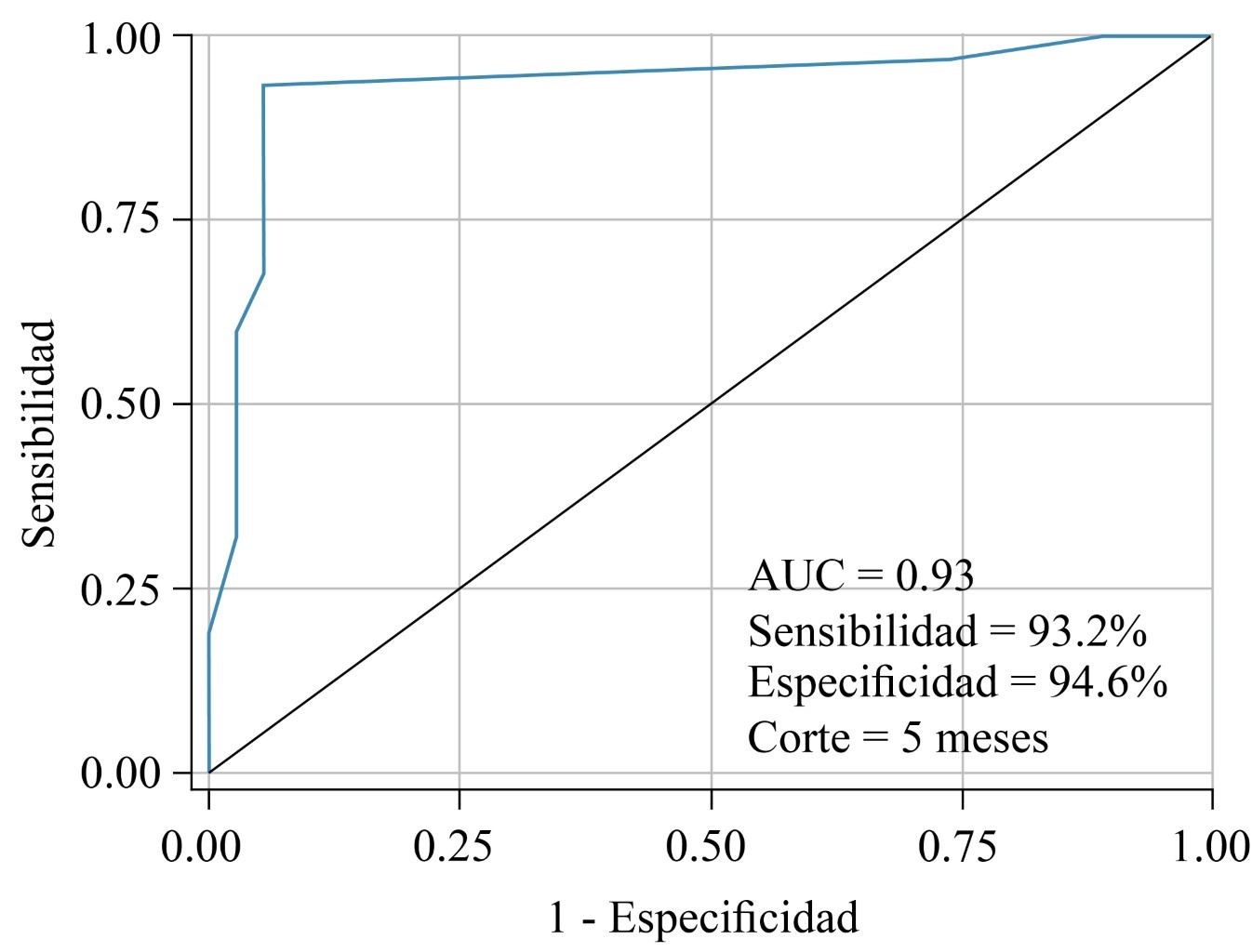 La mediana de tiempo desde el inicio de los síntomas hasta el diagnóstico fue de seis meses (rango: 2-36). Esta variable se dicotomizó usando el análisis de la curva ROC, determinando un valor de corte de cinco meses como óptimo para discriminar entre supervivencia y muerte, con un AUC de 0.93 [IC95%: 0.86-0.97], una sensibilidad de 93.2% y especificidad de 94.6%, como se ilustra en la Figura 1.