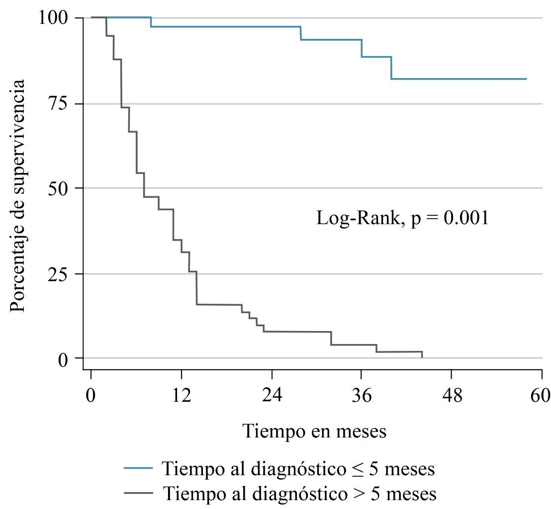 Cuarenta (41.7%) enfermos presentaron metástasis al momento del diagnóstico y 31 (32.3%) durante el seguimiento. Un total de 59 (61.5%) pacientes fallecieron debido a enfermedad metastásica a distancia. El sitio más común de metástasis fueron los pulmones, afectando a 42 (43.8%) pacientes. La mediana del período libre de enfermedad (PLE) para los pacientes sometidos a cirugía preservadora de extremidad fue de 25.5 meses (rango: 12-60). La mediana de supervivencia global fue de 28 meses (rango: 3-60). La Tabla 3 presenta las principales características de las variables de desenlace, mientras que la Tabla 4 expone el análisis univariado y multivariado basado en factores pronósticos para la mortalidad en pacientes con osteosarcoma. La supervivencia de los pacientes diagnosticados después de cinco meses fue significativamente menor, con p = 0.001 (HR = 8.7; IC95%: 10.6-26.9), como se muestra en la Figura 2.