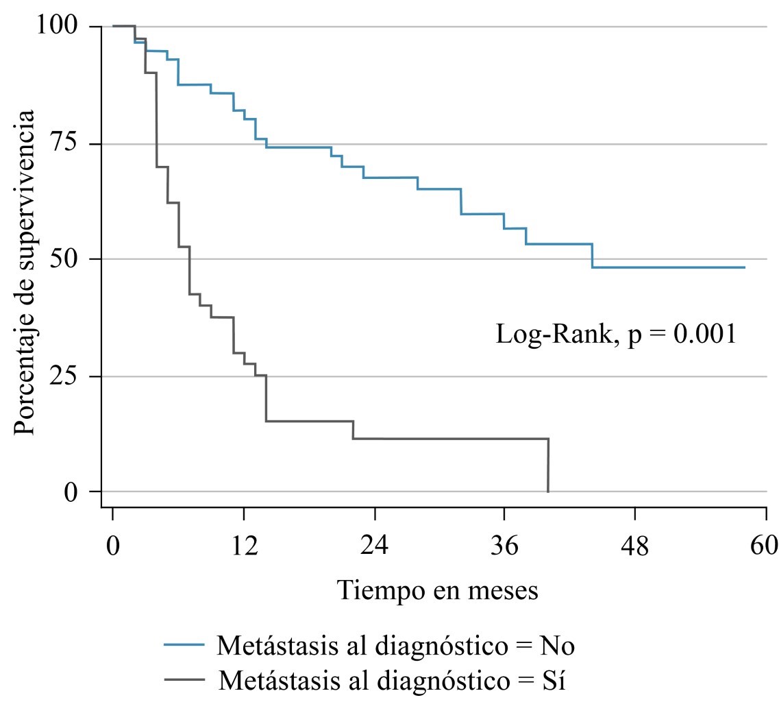 Se encontró asociación significativa entre un retraso diagnóstico mayor a cinco meses y la presencia de metástasis al momento del diagnóstico, p = 0.001 (HR = 10.4; IC95%: 4.1-26). Además, la presencia de enfermedad metastásica al momento del diagnóstico se asoció con mayor riesgo de mortalidad, p = 0.001 (HR = 4.28; IC95%: 2.5-7.3), según se detalla en la Figura 3.
