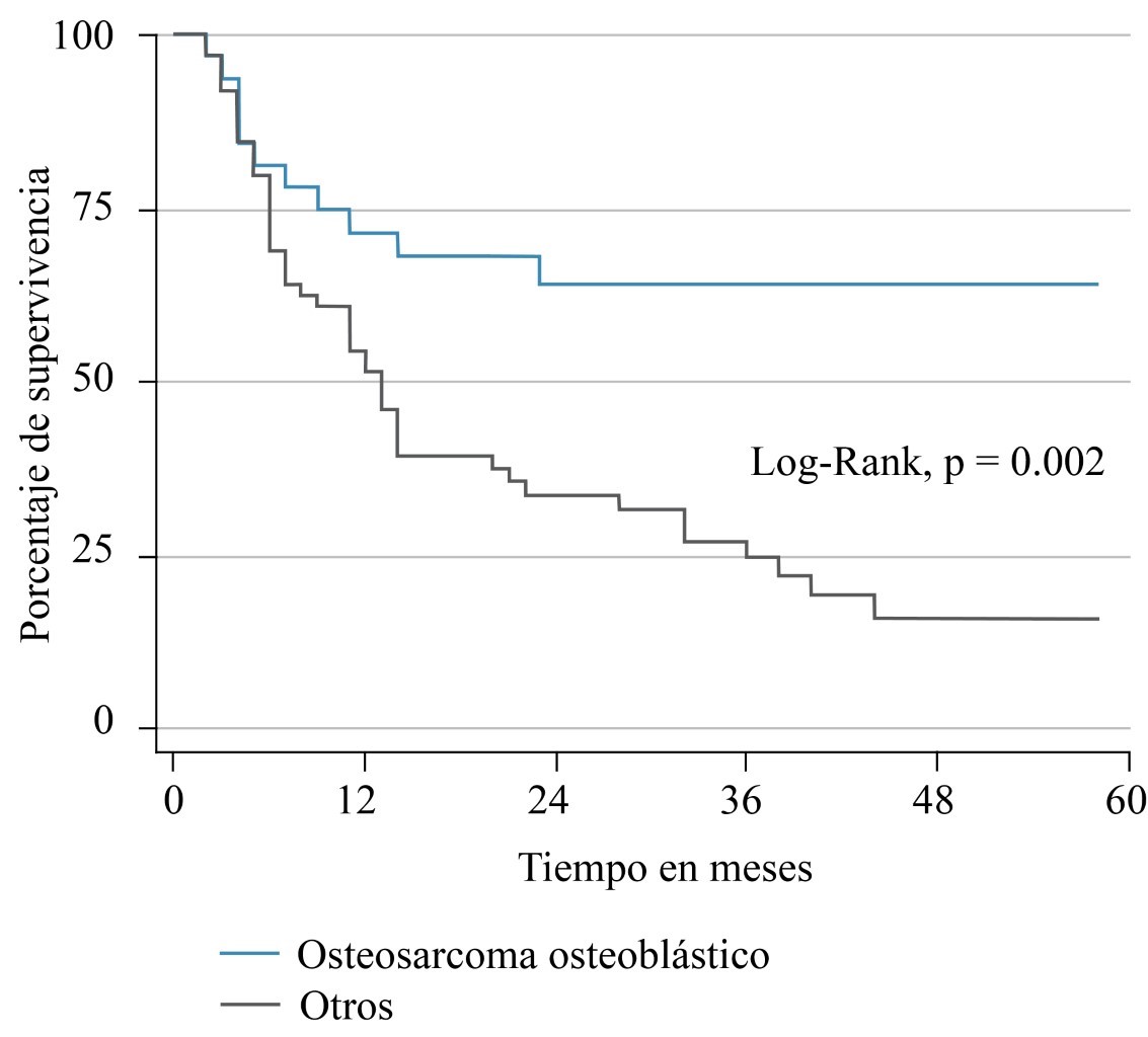 En nuestra serie, el subtipo histológico más frecuente fue el osteosarcoma convencional de tipo osteoblástico, observado en 64 pacientes (66.7%). Además, en nuestra serie se encontró que el osteosarcoma convencional está asociado con menor mortalidad en comparación con otros subtipos histológicos, p = 0.001 (HR = 2.55; IC95%: 1.32-4.93), como se ilustra en la Figura 4. El margen quirúrgico, como se ha observado en otros estudios, tiene un impacto pronóstico significativo (Figura 5).