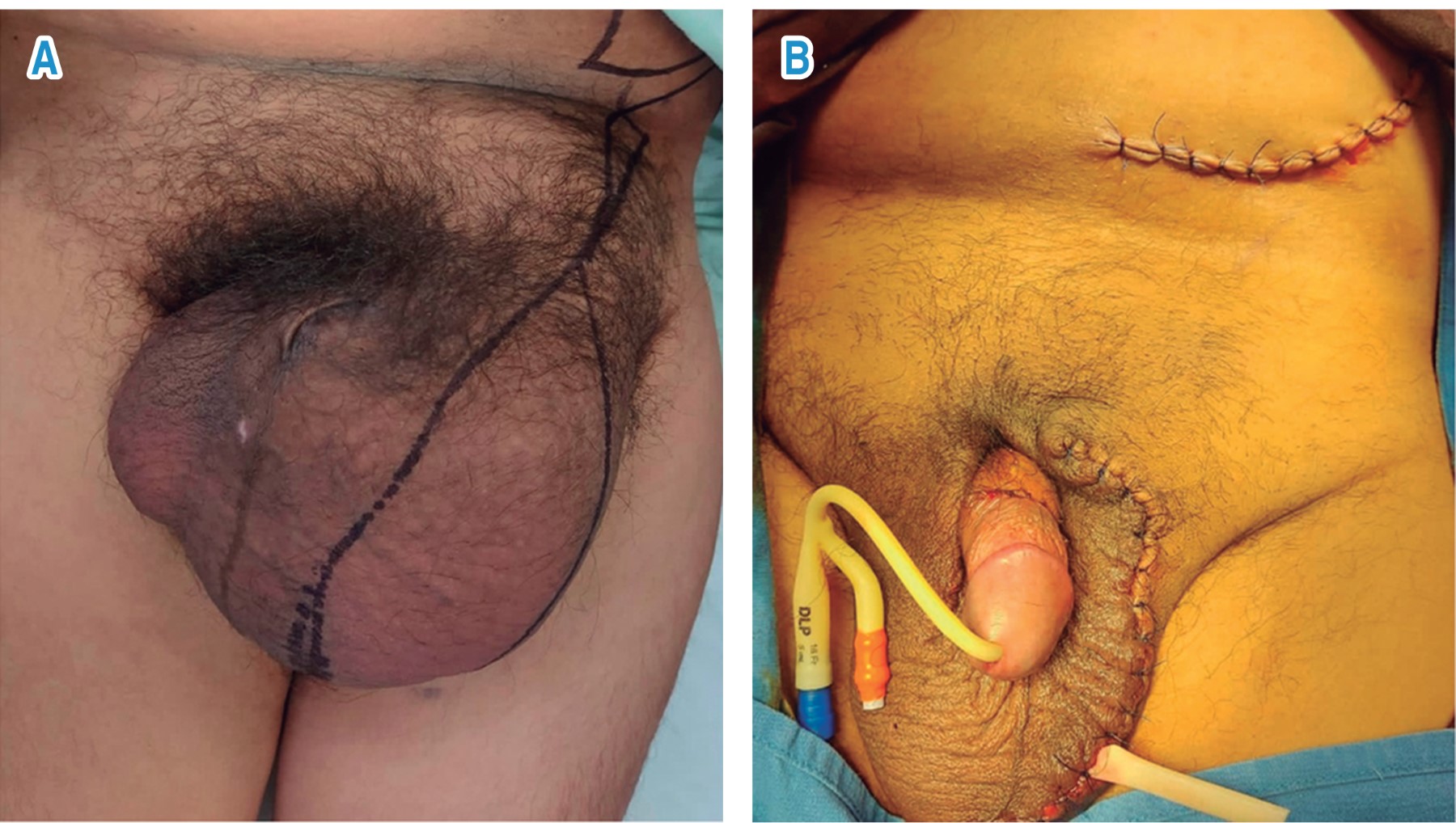 En la exploración física, el paciente tenía un peso de 102 kg, talla de 1.72 cm, índice de masa corporal (IMC) de 35.2 kg/m2. Presentaba una masa inguinoescrotal de grandes dimensiones, no reducible, que llegaba hasta la porción media del muslo, con ruidos peristálticos y sin translucidez. Además, se observó un pene oculto en la totalidad de su longitud y la presencia de dermatitis en la región inguinal y el pliegue abdomino púbico (Figura 1A). Se programó para reparación de hernia inguinal, faloplastía y escrotoplastía.
