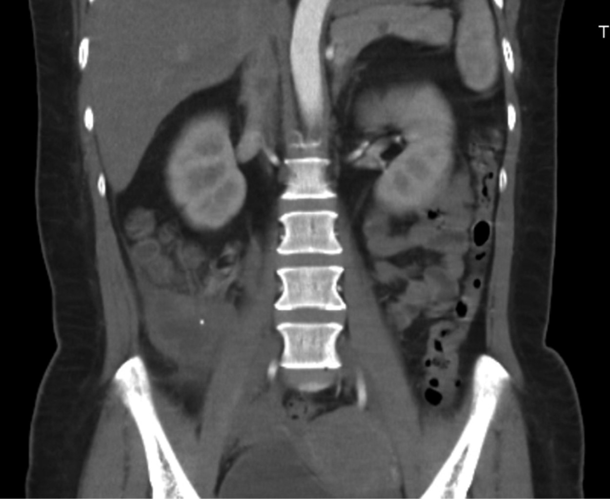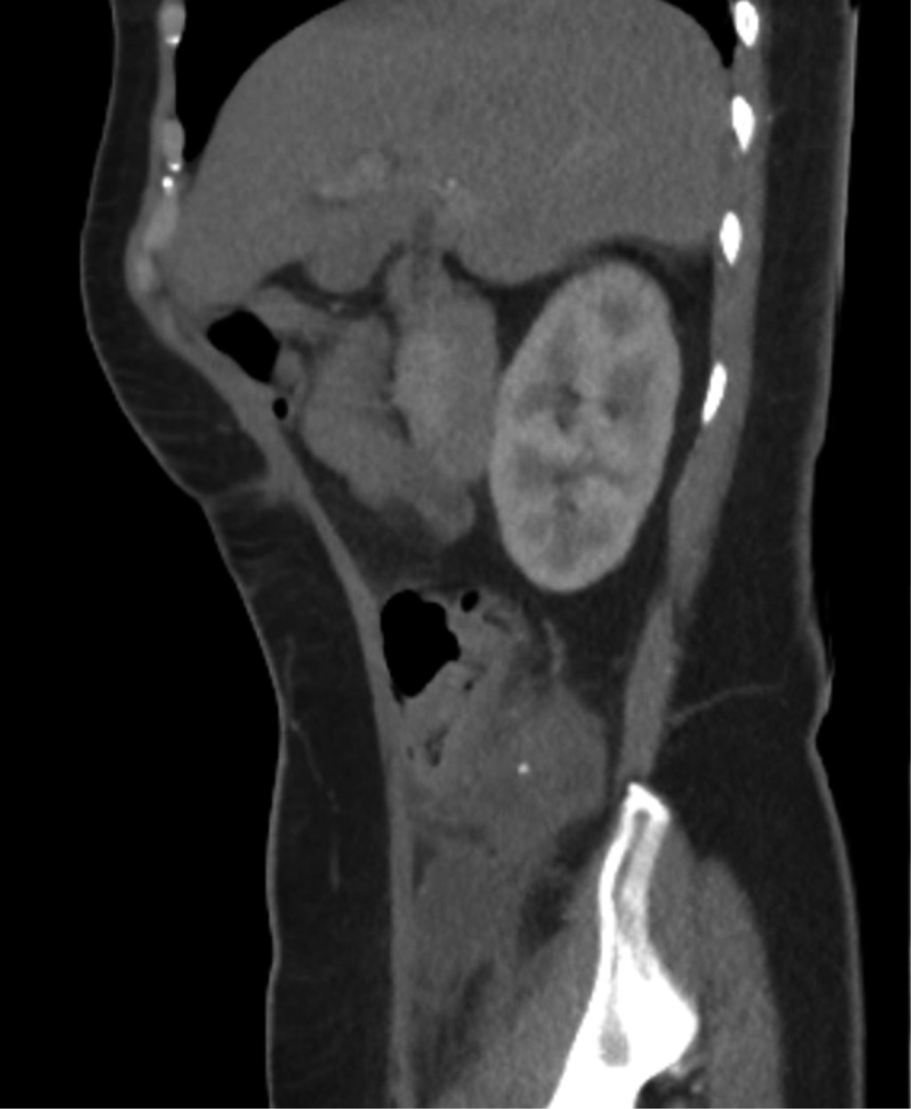 Tomografía simple y contrastada abdominopélvica 03/11/22: colección sub y retrocecal de 50 cm3 con proceso inflamatorio periférico, lo cual sugiere proceso apendicular complicado (Figuras 1 y 2).